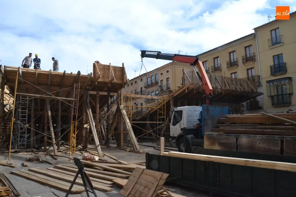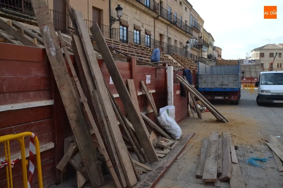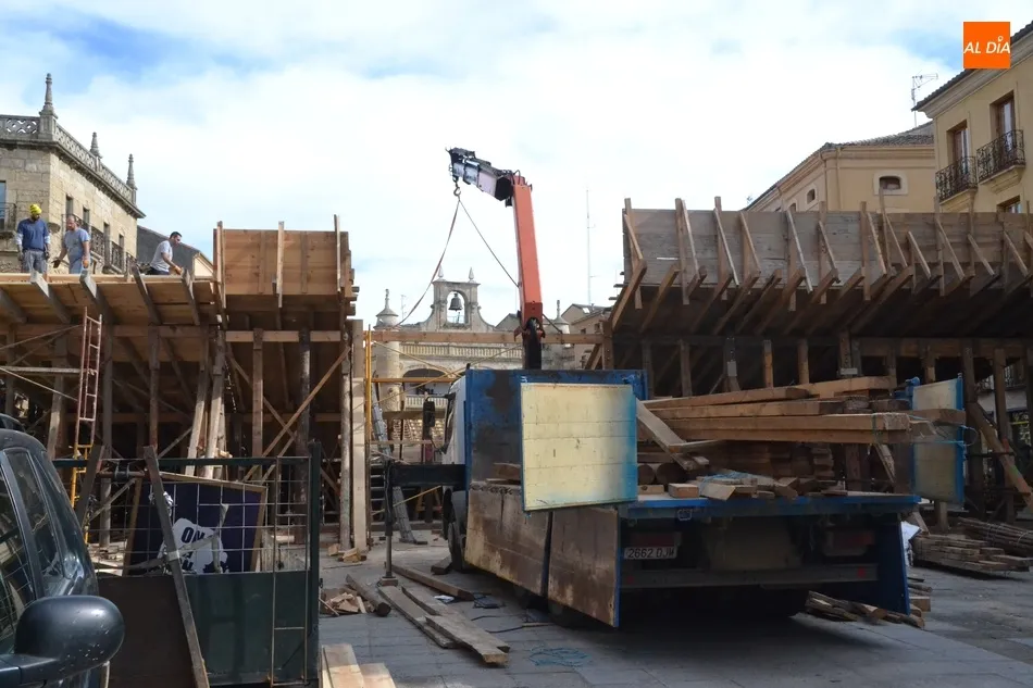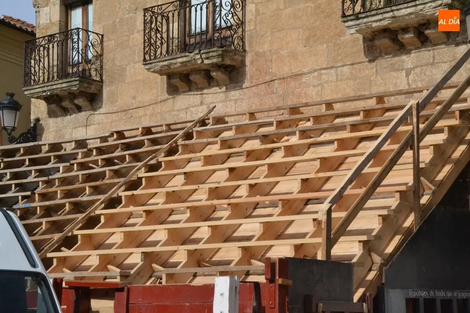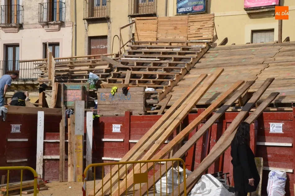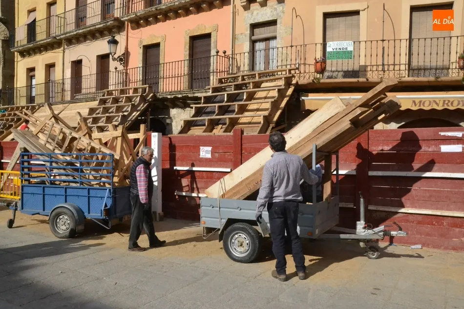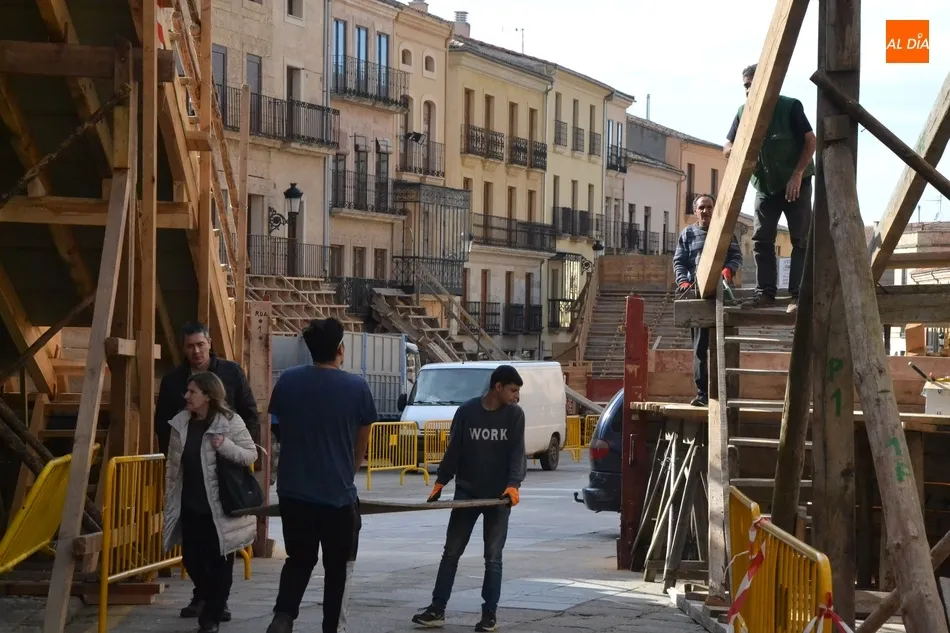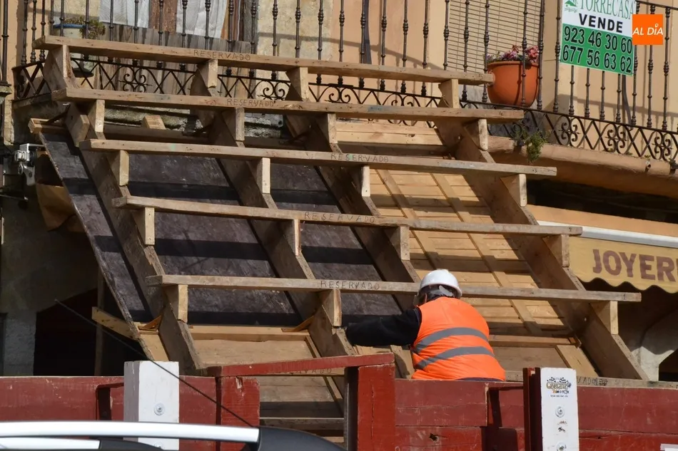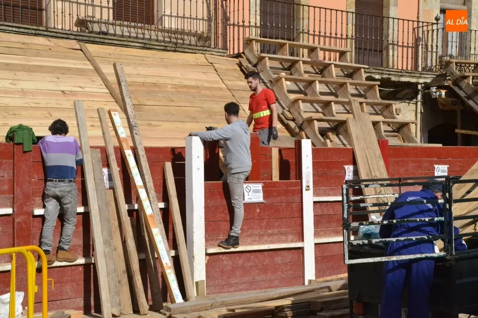 Como suele ser habitual, la actividad en la Plaza Mayor fue especialmente frenética durante la mañana del sábado, con un trajín continuo tanto de vehículos llevando las diversas piezas de los tablaos del gran coso como de mirobrigenses y forasteros que querían seguir de cerca las tareas de construcción.