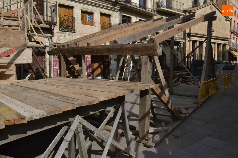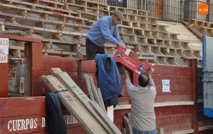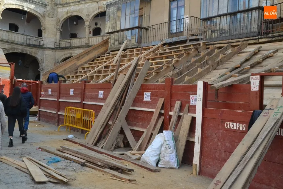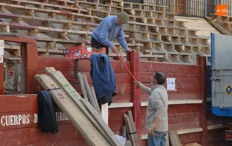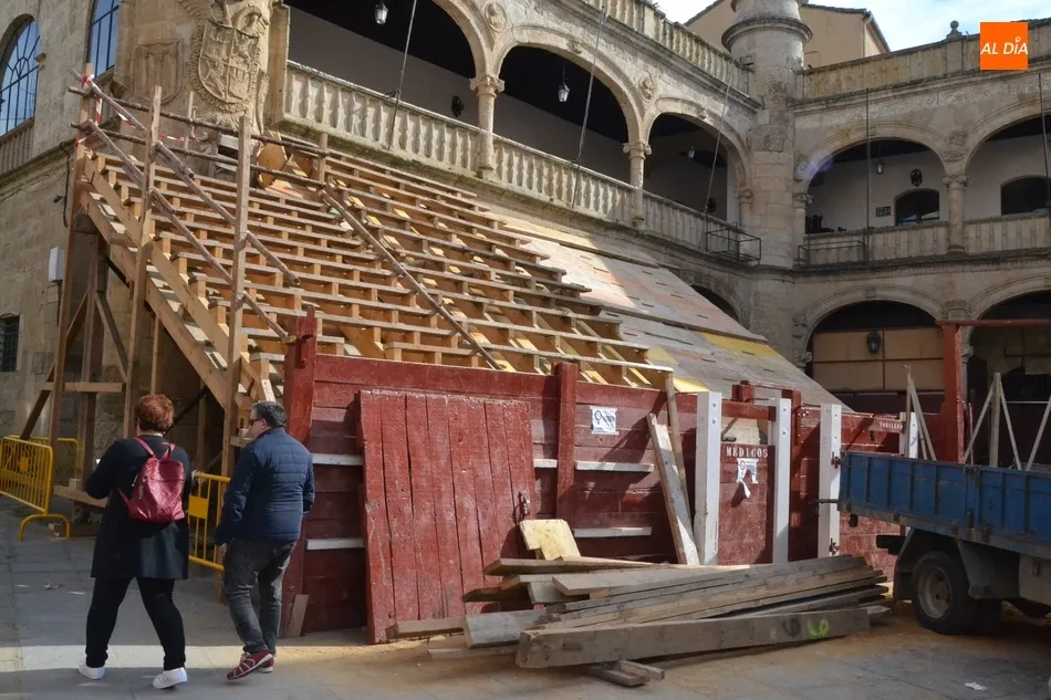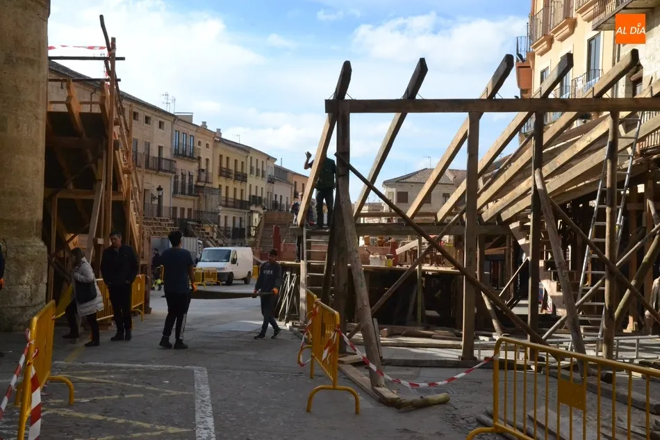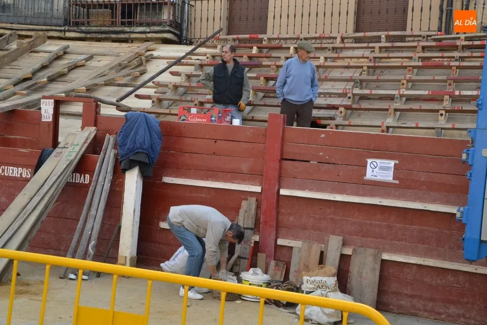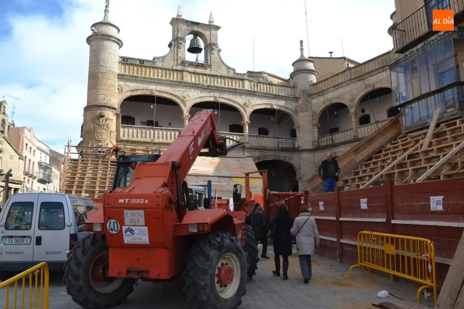 Con unas fantásticas condiciones meteorológicas (salvo por la niebla con la que amaneció este sábado la ciudad), la Plaza Mayor de Ciudad Rodrigo continúa en plena transformación para quedar convertida a la conclusión de este fin de semana precarnavalero en un coso taurino donde se sucederán todo tipo de emociones desde la tarde del Viernes.