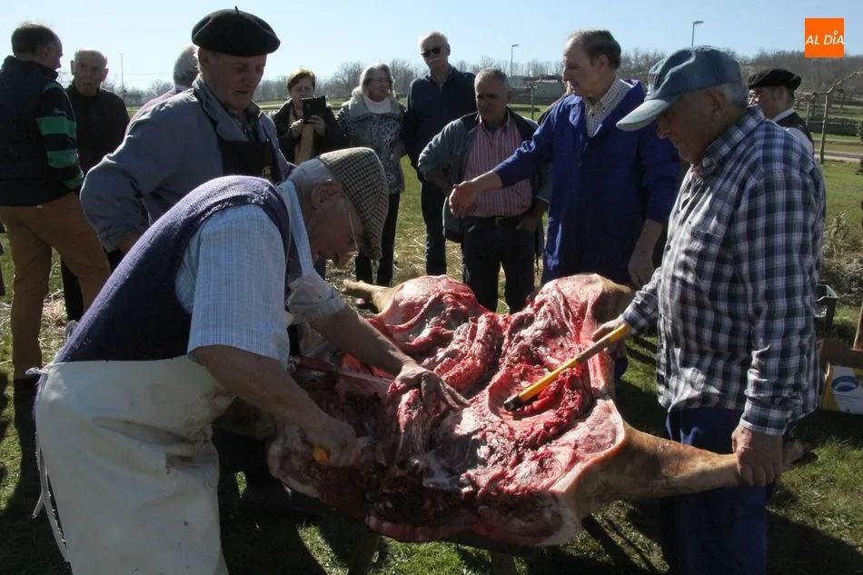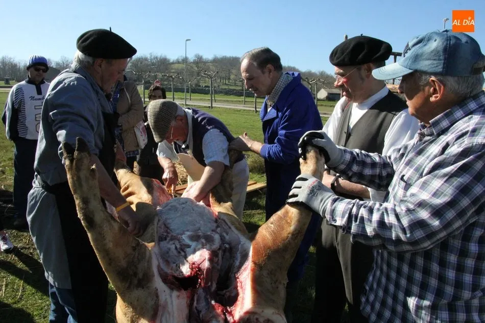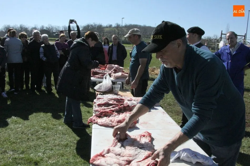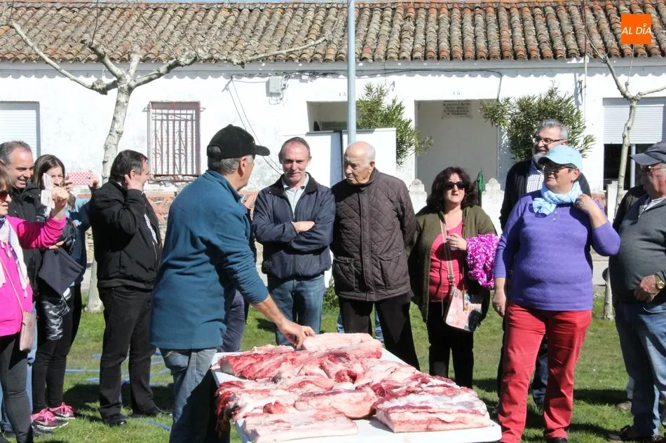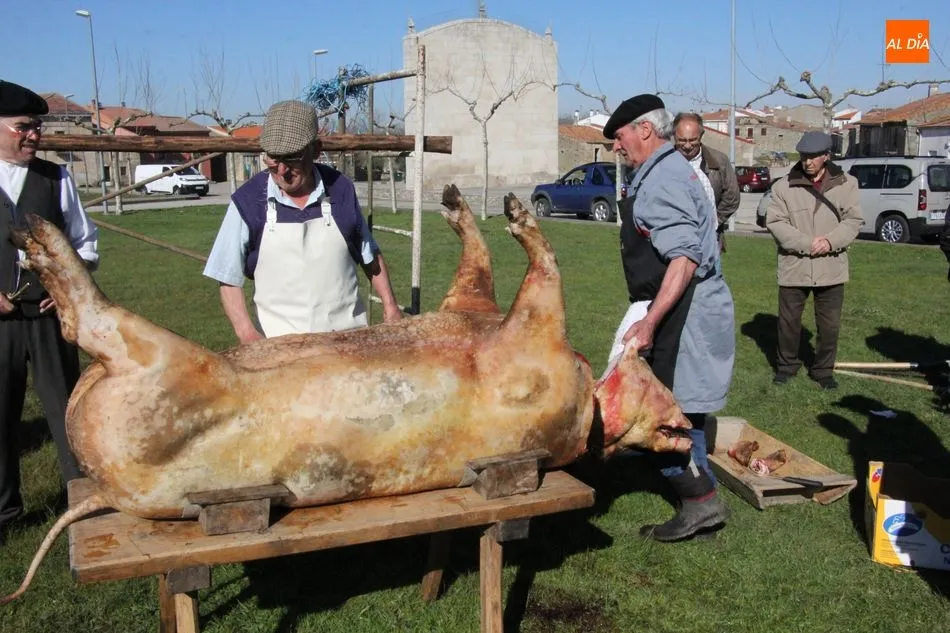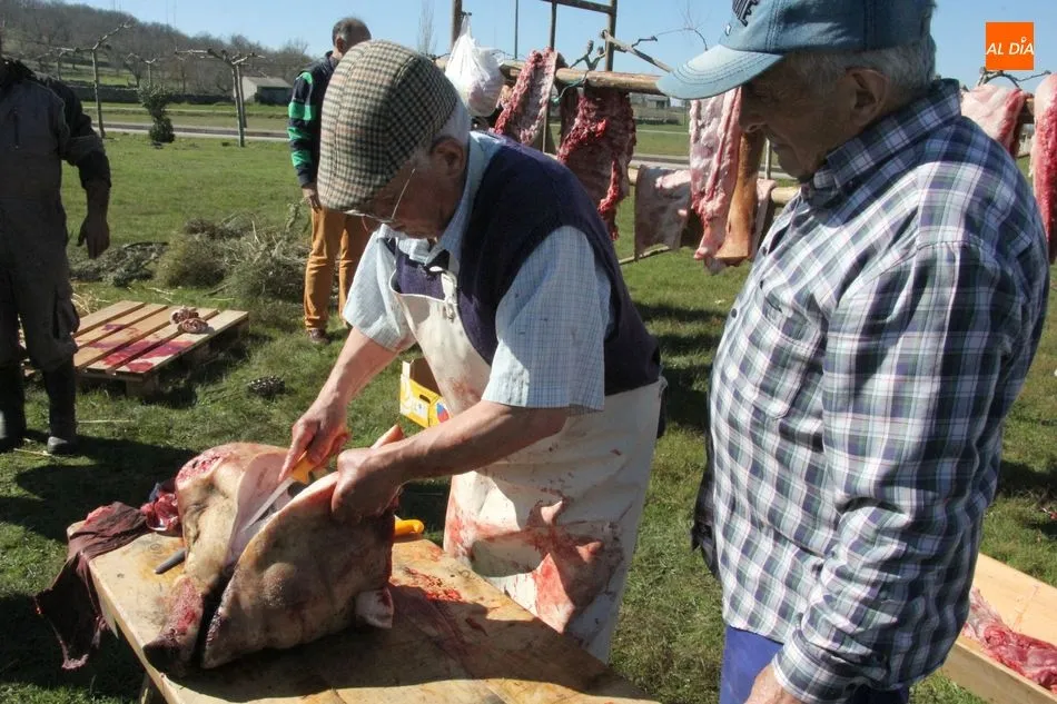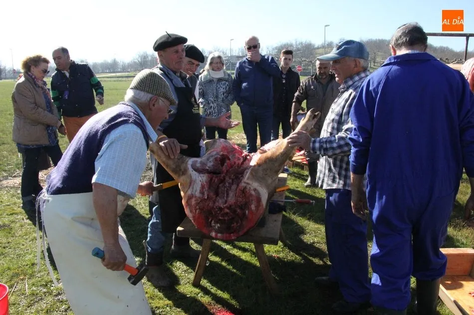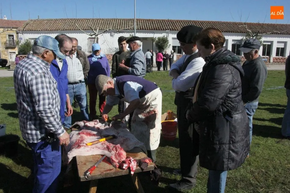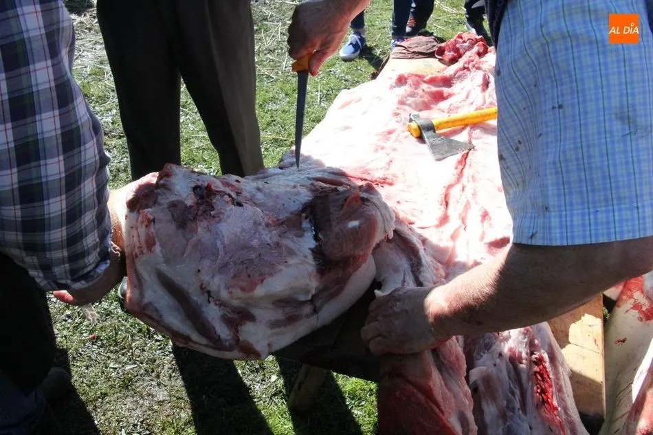 Así, una vez limpio y sobre el tajo, Manuel, en calidad de matancero, se encargaba de separar las distintas piezas del animal ante la mirada atenta y curiosa de vecinos y visitantes. Jamones, paletas, lomos, panceta y el resto de las distintas partes del cerdo serían posteriormente presentadas por el Maestro de Ceremonias para subastarse entre el público asistente.