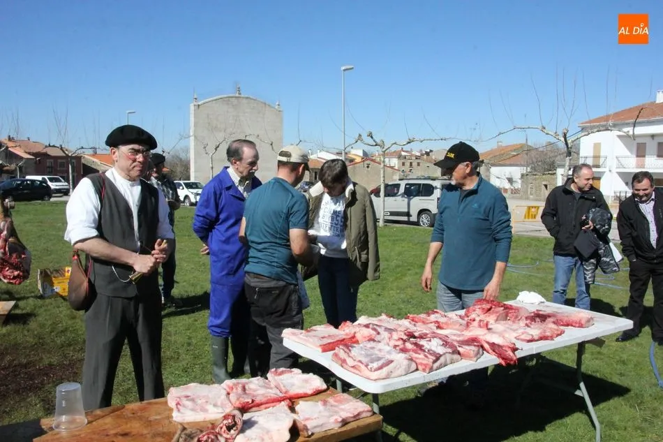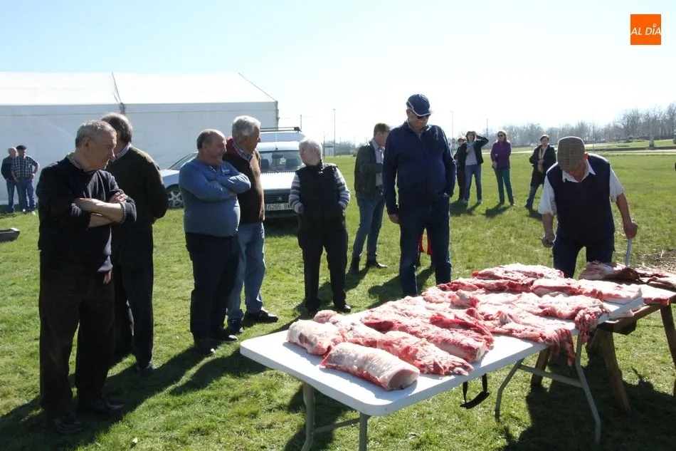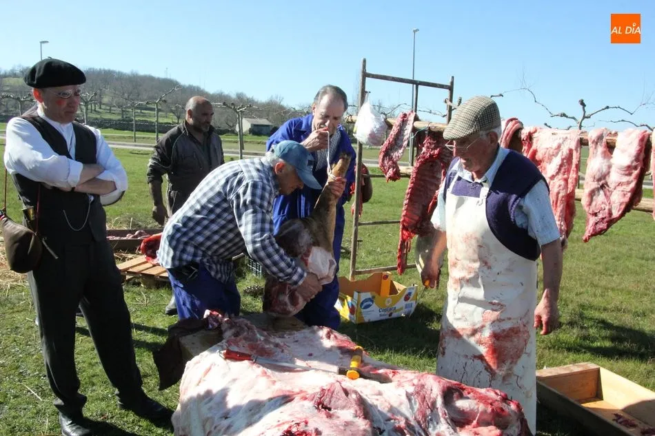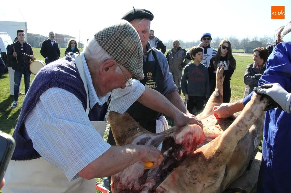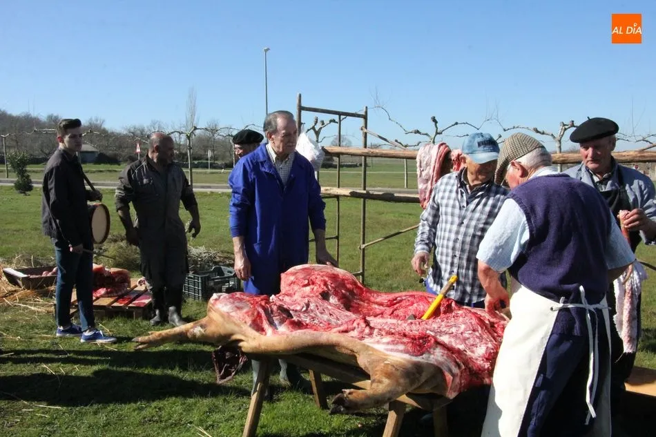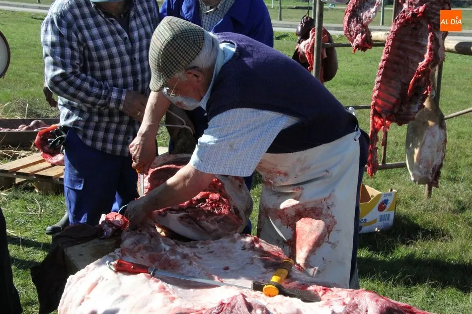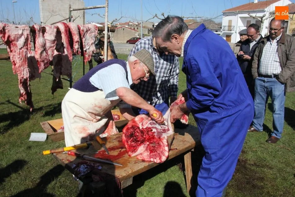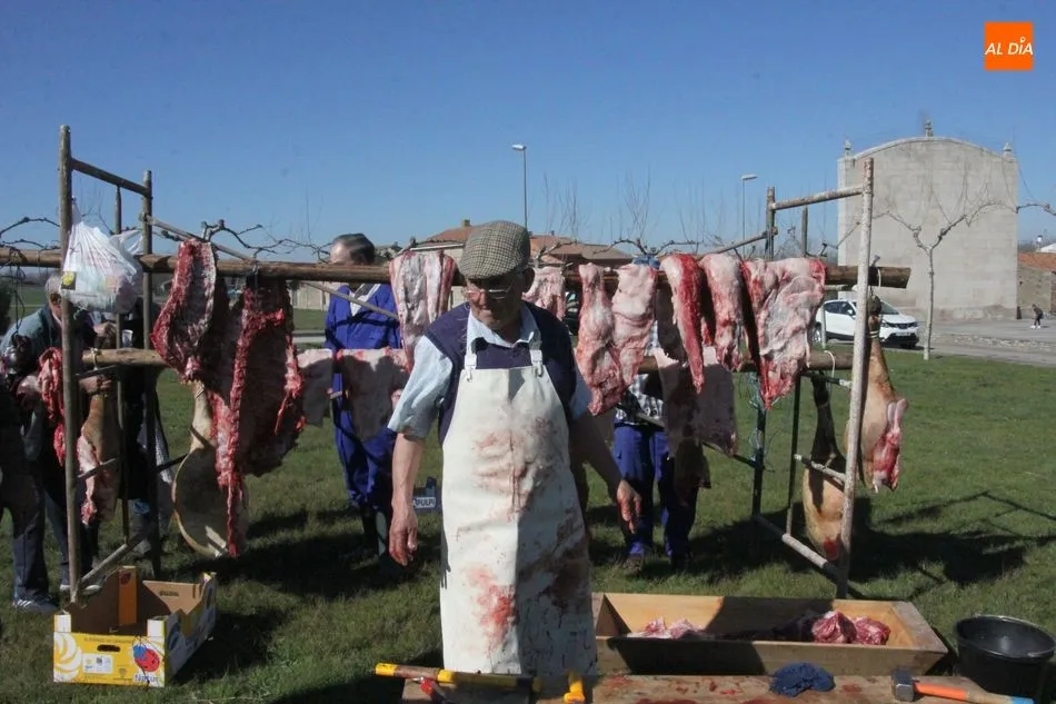 Así, una vez limpio y sobre el tajo, Manuel, en calidad de matancero, se encargaba de separar las distintas piezas del animal ante la mirada atenta y curiosa de vecinos y visitantes. Jamones, paletas, lomos, panceta y el resto de las distintas partes del cerdo serían posteriormente presentadas por el Maestro de Ceremonias para subastarse entre el público asistente.