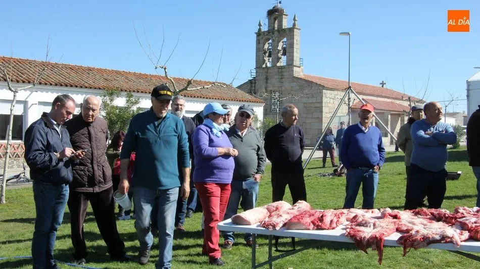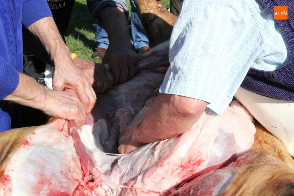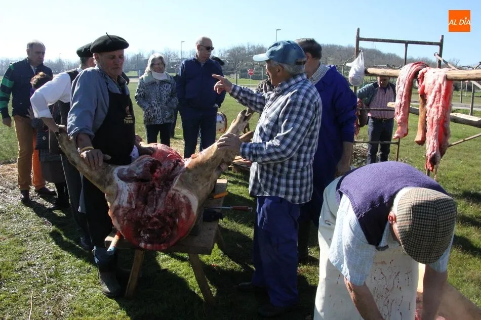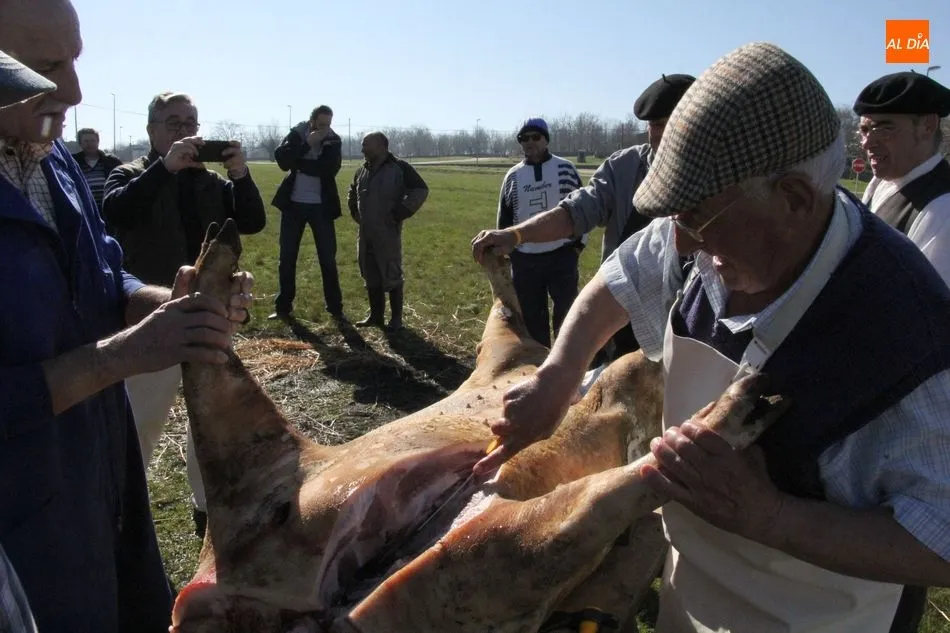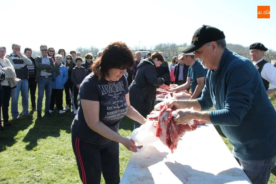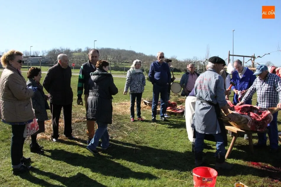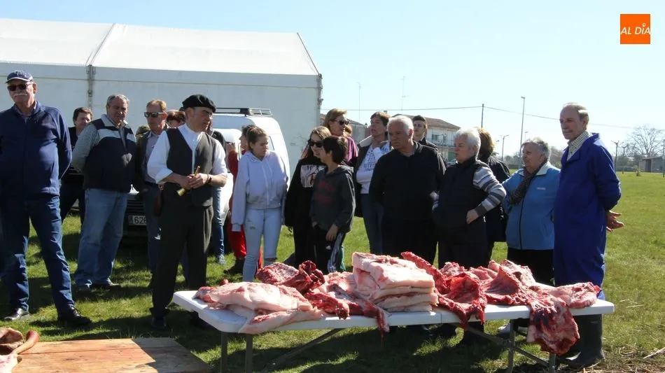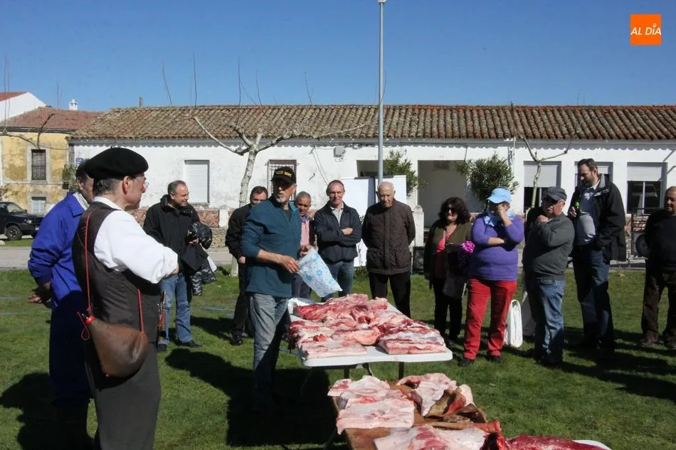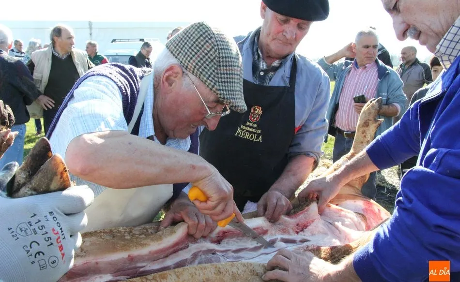 Así, una vez limpio y sobre el tajo, Manuel, en calidad de matancero, se encargaba de separar las distintas piezas del animal ante la mirada atenta y curiosa de vecinos y visitantes. Jamones, paletas, lomos, panceta y el resto de las distintas partes del cerdo serían posteriormente presentadas por el Maestro de Ceremonias para subastarse entre el público asistente.