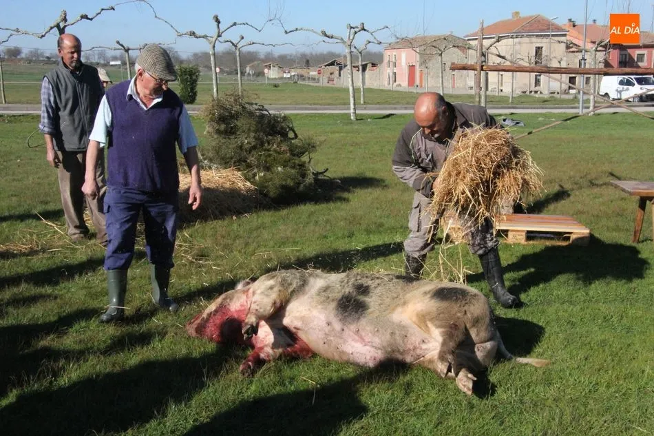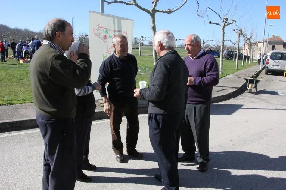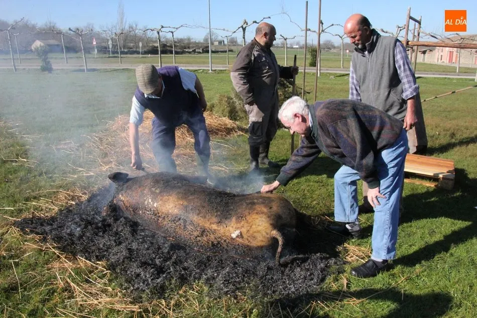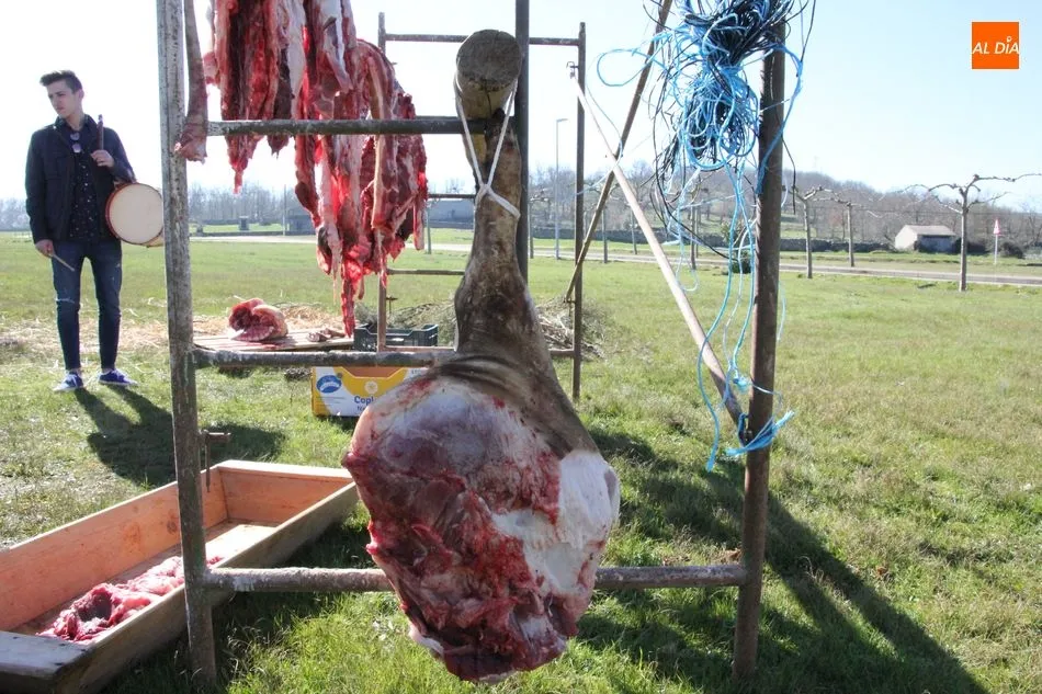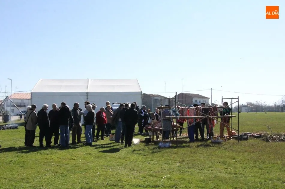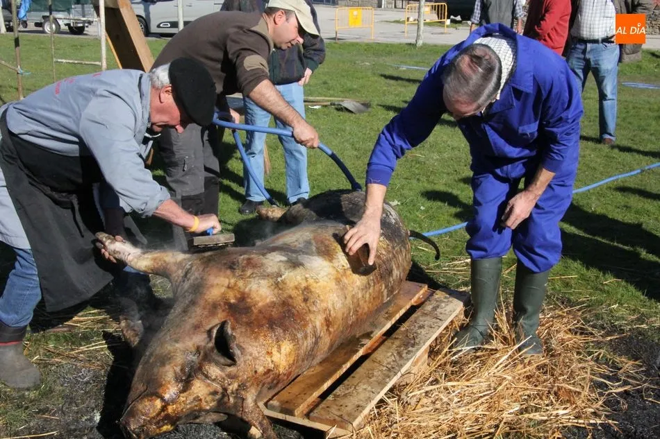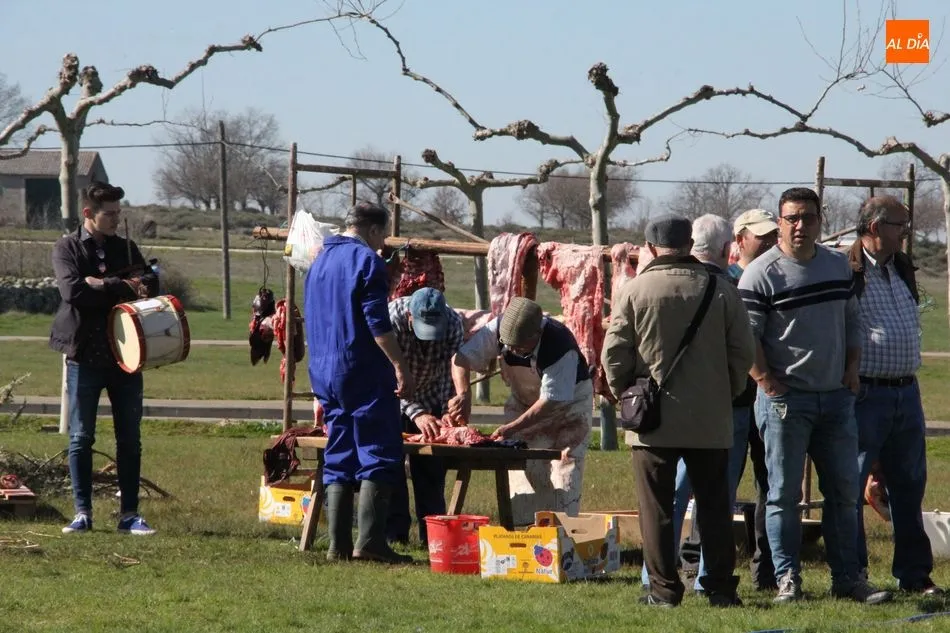 Bajo un sol nada propio de febrero, a partir de las 11.00 de la mañana, y una vez sacrificado el animal, una marrana de 240 kg., se procedía al chamuscado y raspado de la cochina, actos que contaron con un animado ambiente y la actuación de un tamborilero. Mientras, Paqui y sus ayudantes iban preparando las patatas meneás con sus torreznos, que se servirían en la comida y cuyo menú se completaba con chichas y huevo frito, además de pan, postre y bebida.