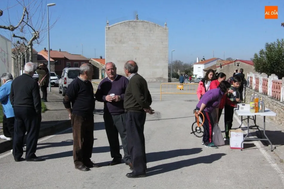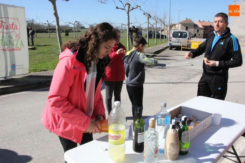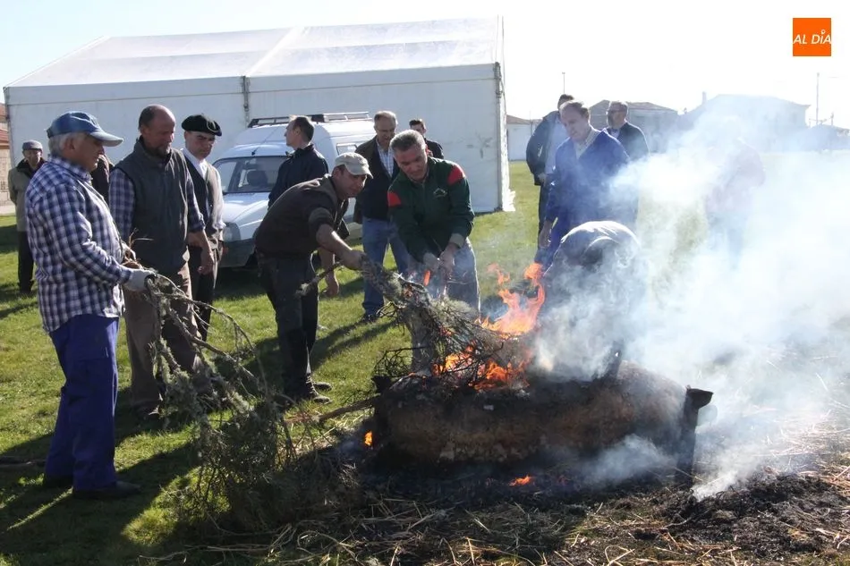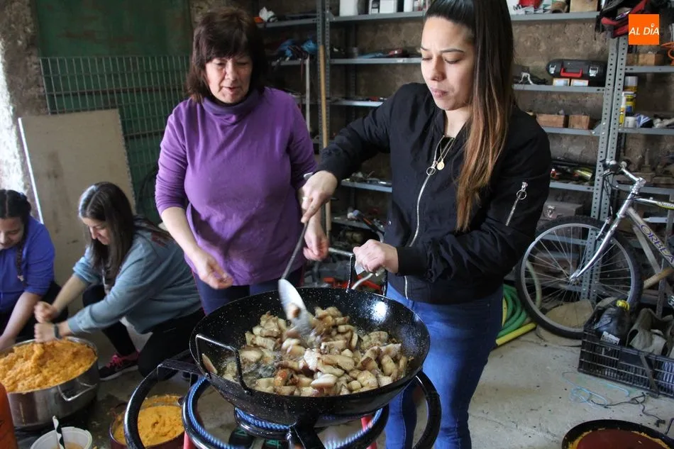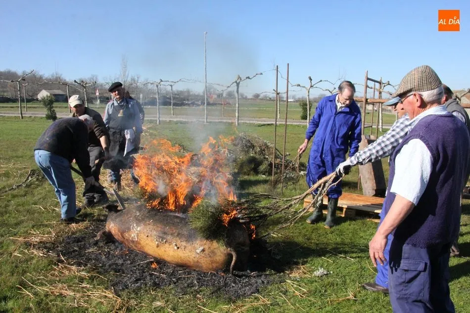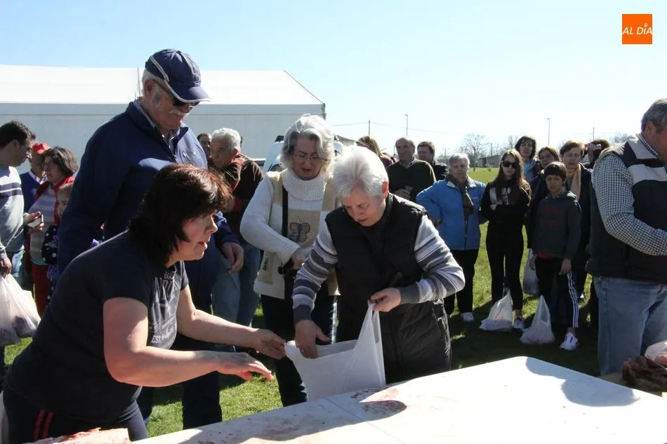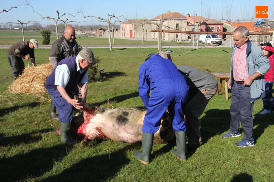 Bajo un sol nada propio de febrero, a partir de las 11.00 de la mañana, y una vez sacrificado el animal, una marrana de 240 kg., se procedía al chamuscado y raspado de la cochina, actos que contaron con un animado ambiente y la actuación de un tamborilero. Mientras, Paqui y sus ayudantes iban preparando las patatas meneás con sus torreznos, que se servirían en la comida y cuyo menú se completaba con chichas y huevo frito, además de pan, postre y bebida.