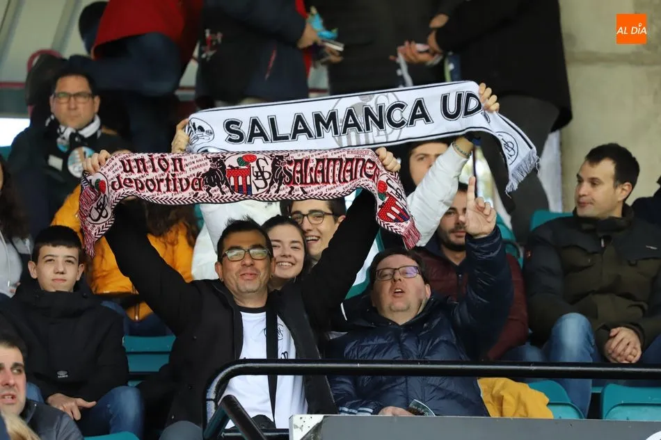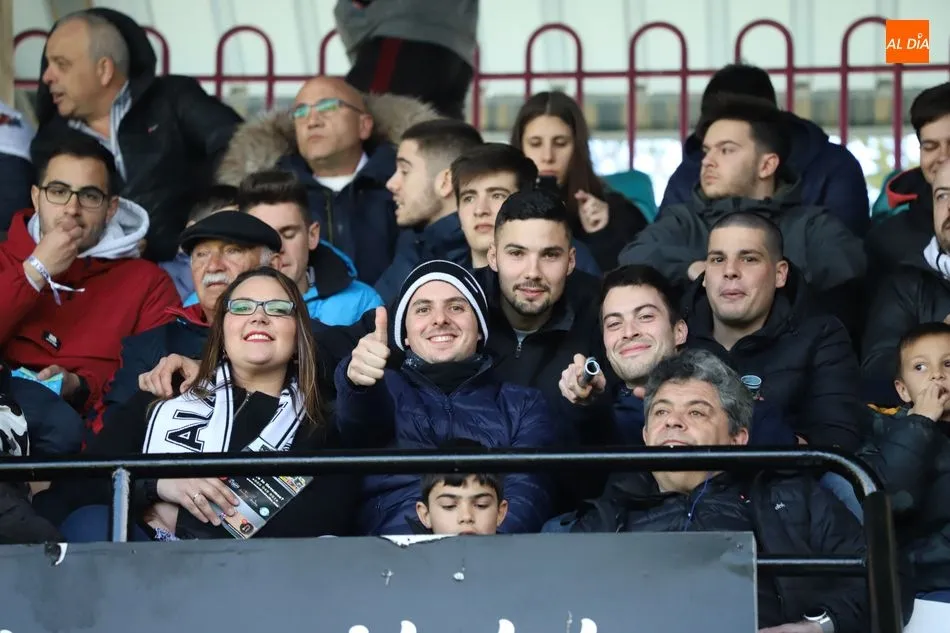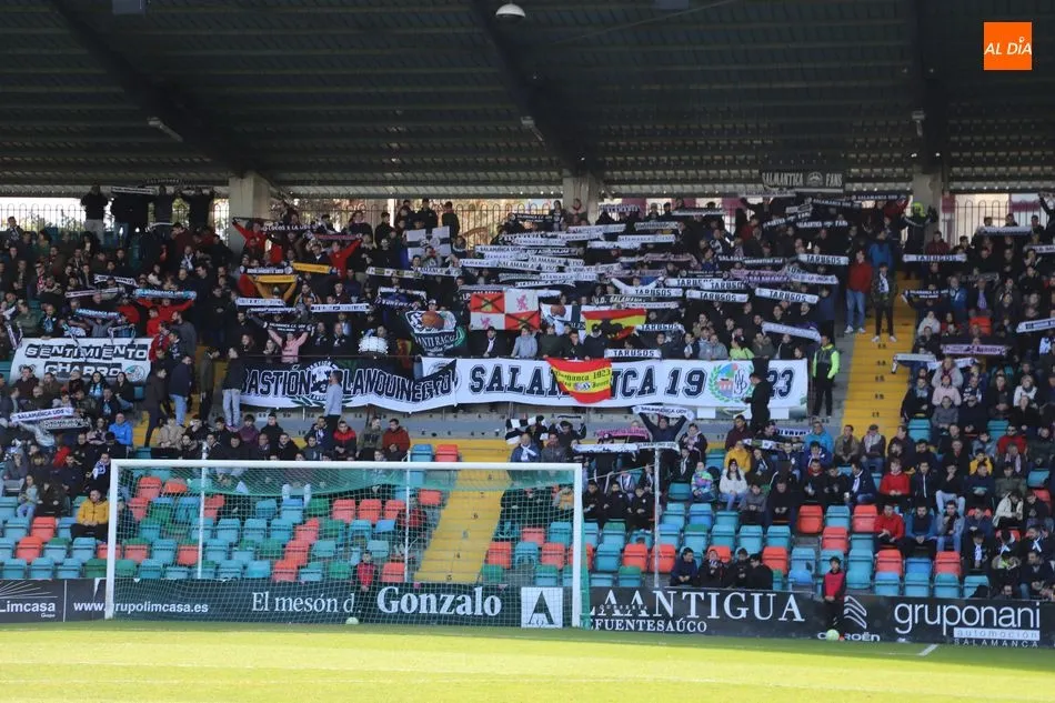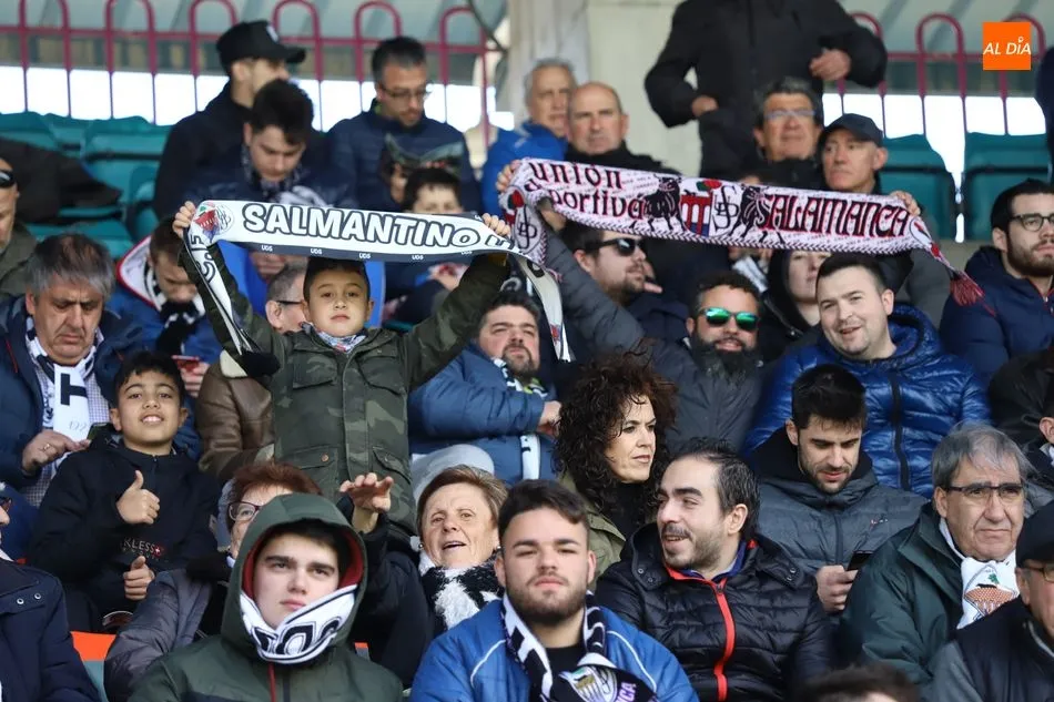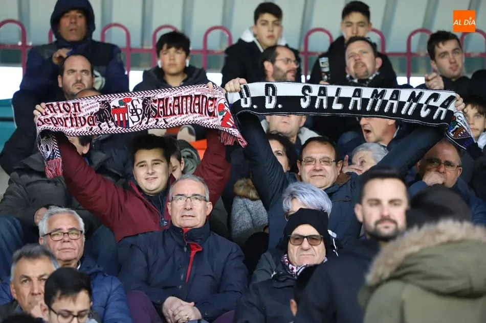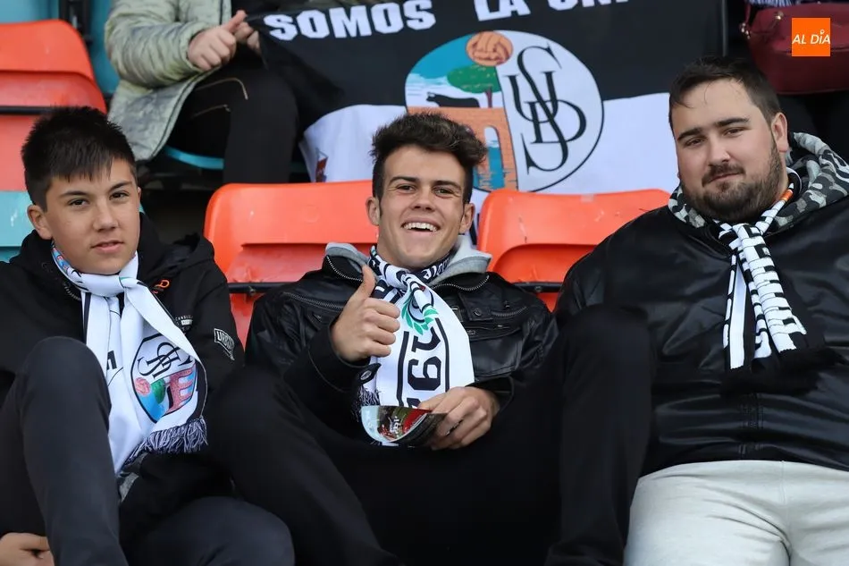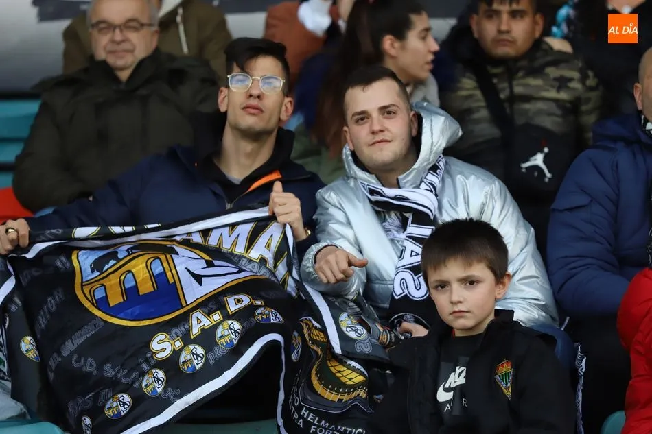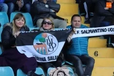 El buen ambiente reinó en el derbi del Helmántico entre las aficiones. Los seguidores del Salamanca UDS y el Guijuelo disfrutaron de una gran jornada de fútbol en el coliseo charro.