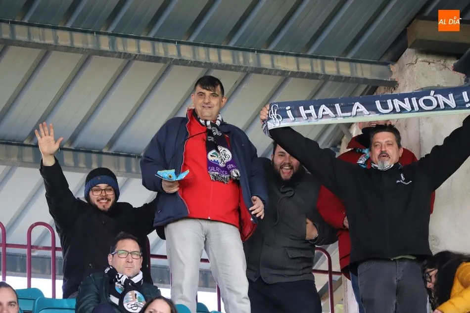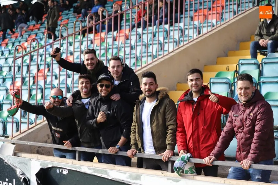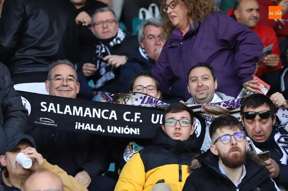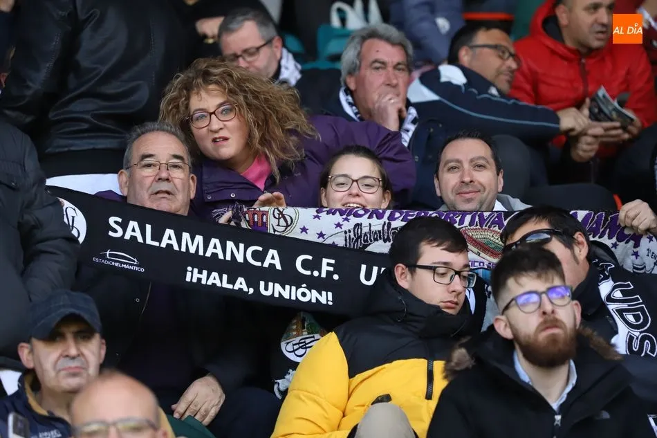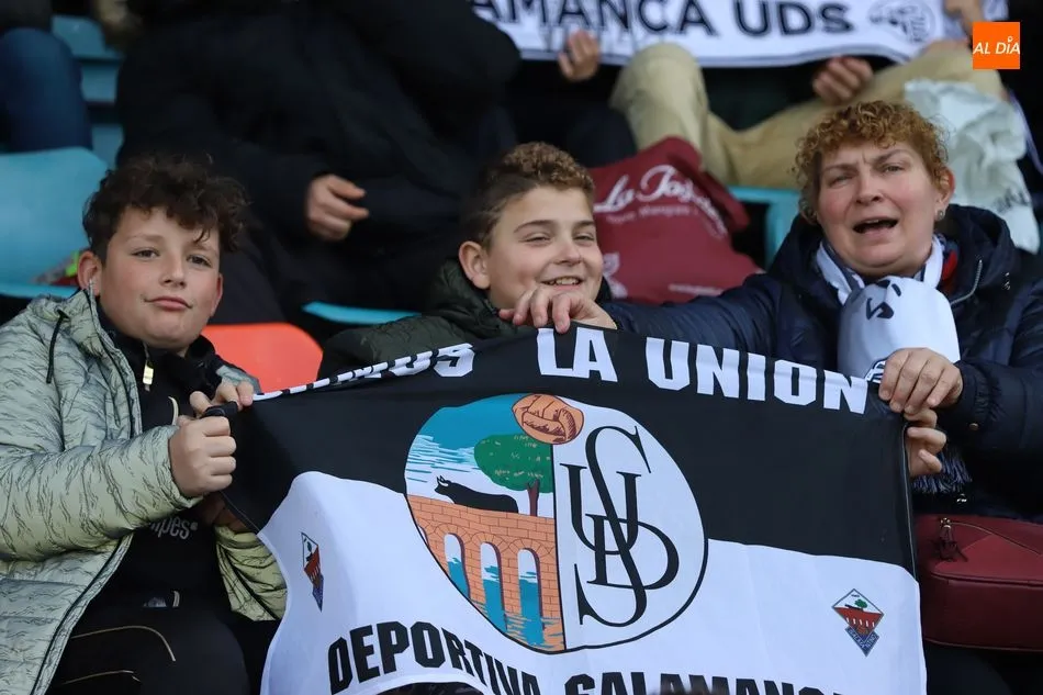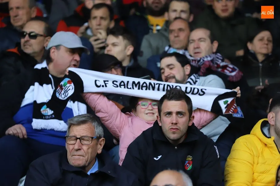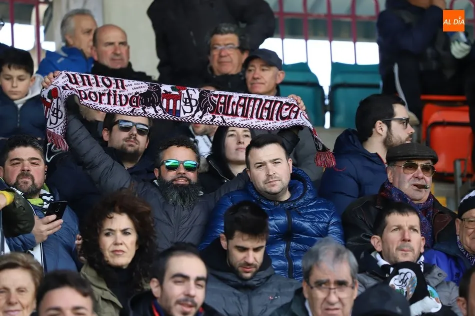 El buen ambiente reinó en el derbi del Helmántico entre las aficiones. Los seguidores del Salamanca UDS y el Guijuelo disfrutaron de una gran jornada de fútbol en el coliseo charro.