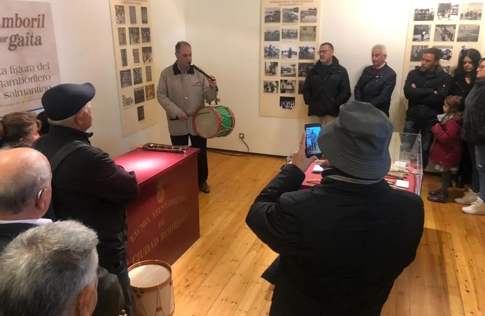 Ciudad Rodrigo recibió en la jornada del sábado a 40 miembros de la Asociación de Tamborileros Zamoranos que dirige el famoso tamborilero Luis Antonio Pedraza. El motivo principal de la visita era recorrer la exposición Tamboril por Gaita. La figura del tamborilero salmantino, que les fue explicada por su comisario, José Ramón Cid Cebrián, y dos alumnos de la Escuela Municipal de Tamborileros de Ciudad Rodrigo, Tomás y Agustín.