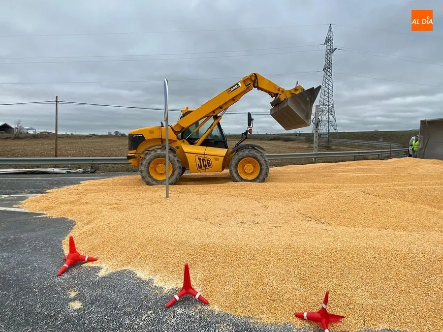 El siniestro se saldaba sin heridos y una excavadora acudía al lugar para recoger la carga de de maíz que quedó desparramada en la calzada