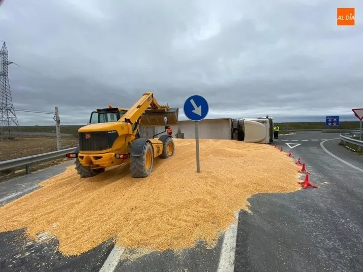 Un camión cargado de maíz volcaba esta mañana, alrededor de las 11.00 horas, en la rotonda que conecta la carretera N-501 con Encinas de Abajo. Como consecuencia de ello, la mercancía que transportaba quedaba esparcida sobre la calzada.