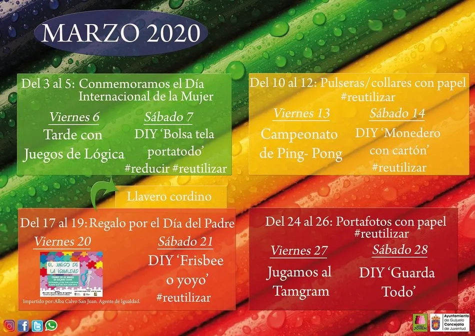 Desde el martes 10 al jueves 12, proponen crear pulseras y collares de papel, mientras que el fin de semana tendrán un campeonato de ping pong y una manualidad para hacer monederos reutilizando cartón. En la tercera semana de marzo destinarán los días, del 17 al 19, para hacer un regalo por el Día del Padre y ese fin de semana realizarán el viernes el juego de la igualdad, destinado a jóvenes desde 5º de Primaria a 2º de ESO y el sábado proponen construir un frisbee o yoyó con materiales reciclados. El mes finalizará con la creación de un portafotos con papel reutilizado, el juego tamgram para el viernes 27 y un taller de DIY que se centrará en hacer un ?Guarda todo?, el sábado 28.