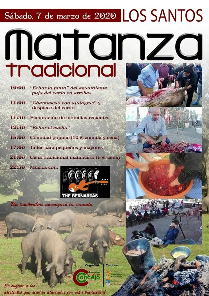 Un año más, Los Santos celebra su matanza tradicional que se celebrará el próximo sábado, 7 de marzo. La propuesta es similar a la de otras ocasiones, con el despiece del animal en la Plaza Mayor y varias degustaciones para los presentes. La comida se servirá a las 15.00 horas con un precio de 10 euros por la comida y por la cena. La cena será a las 21.00 horas y tiene un precio individual de 6 euros. No faltará la música tradicional de la gaita y el tamboril y la actuación del grupo The Bernardas para concluir la jornada.