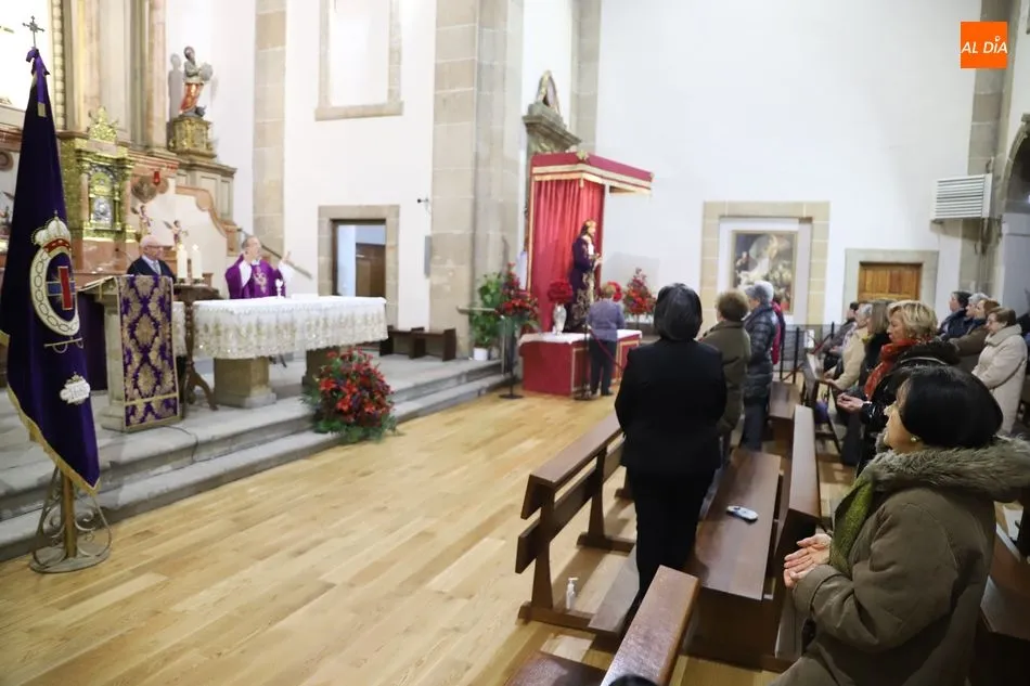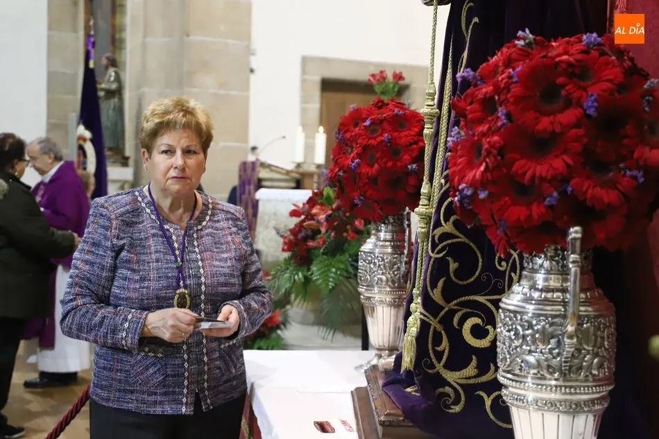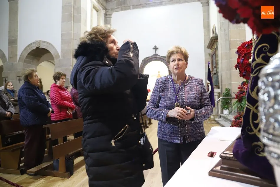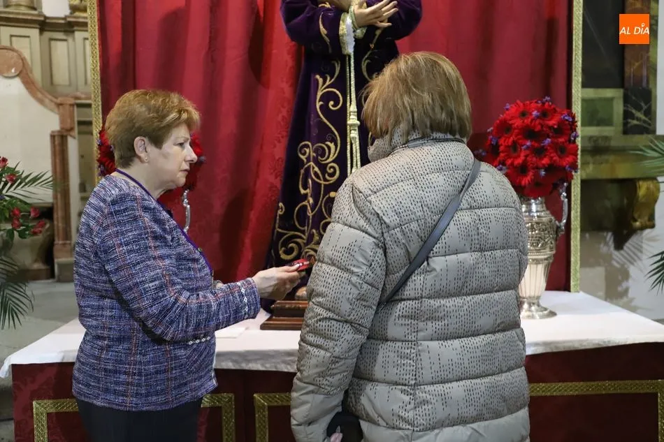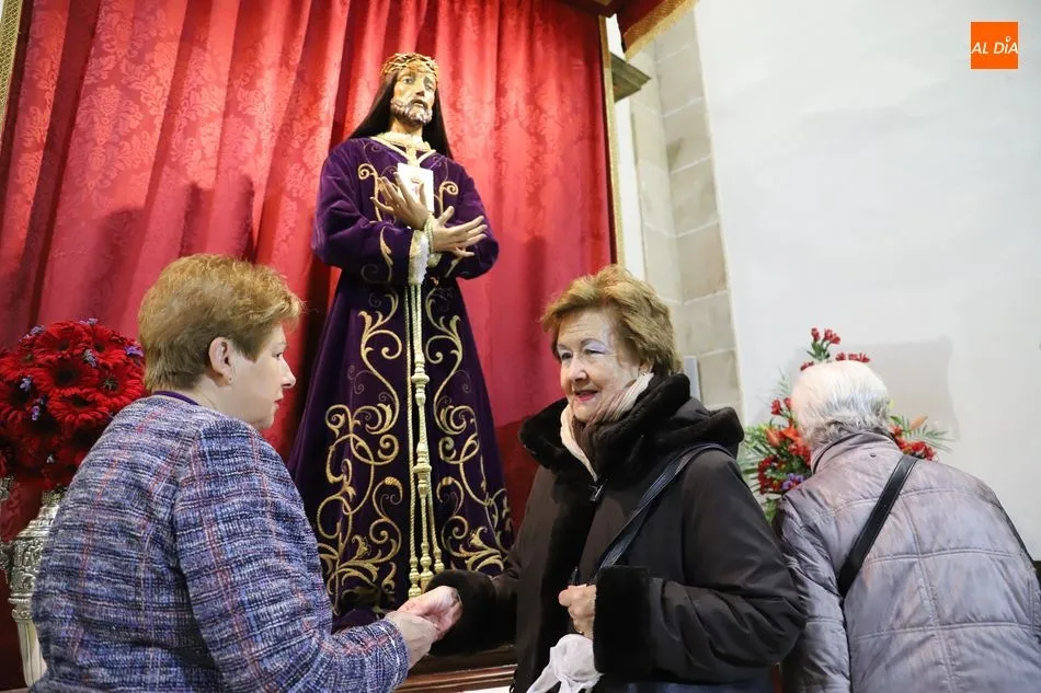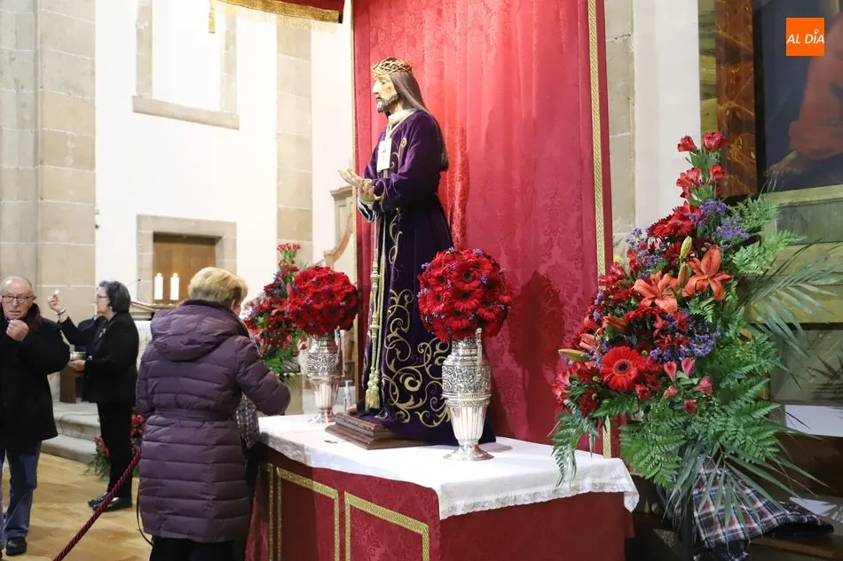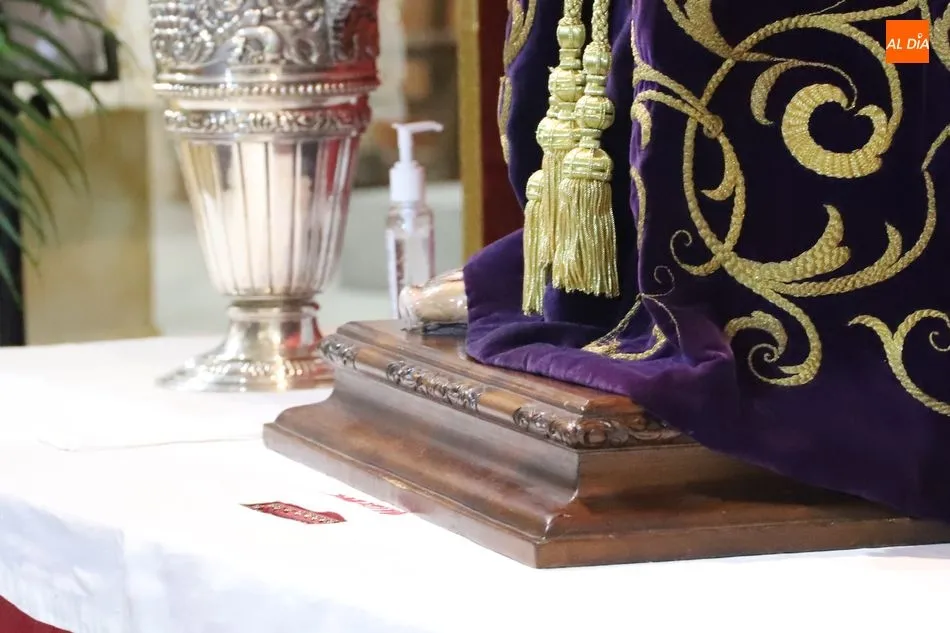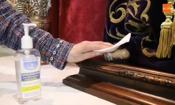 Así, siguiendo las recomendaciones de la Junta de Castilla y León, el citado besapiés se ha sustituido por una reverencia ante la talla para prevenir posibles contagios de covid-19 (Coronavirus). ?No se puede ni besar, ni tocar?, explicaba una voluntaria junto a la talla, que también ha regañado a varias personas y cada vez que la tocaban lo limpiaba con gel desinfectante.