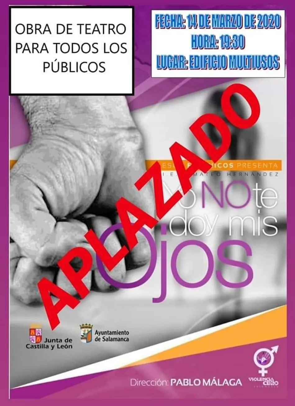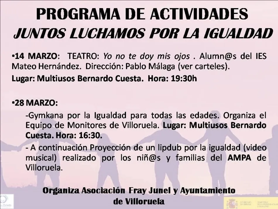 Aplazan las propuestas organizadas en Villoruela para apoyar la lucha por la igualdad. El programa de actividades que tiene por título Juntos luchamos por la igualdad, tenía previsto comenzar este sábado con la obra de teatro Yo no te doy mis ojos. Los actore son los alumnos del IES Mateo Hernández, bajo la dirección de Pablo Málaga.