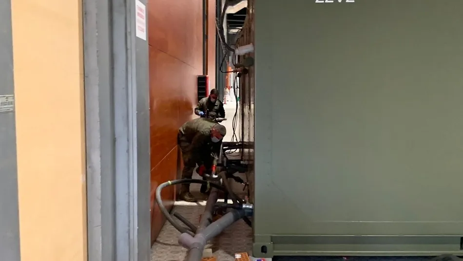 El Regimiento de Ingenieros número 11 refuerza con nuevos medios, que se suman a los ya desplegados, en apoyo a la instalación del hospital provisional en la Institución Ferial de Madrid (IFEMA). Ante la necesidad presentada por los representantes civiles de la construcción del hospital, se han ampliado los servicios de saneamiento puestos en funcionamiento por el personal de este Regimiento.