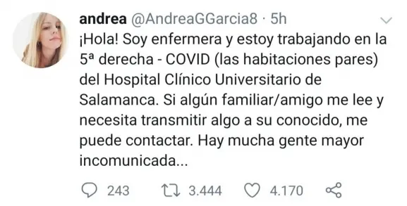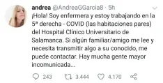 Una enfermera salmantina, que utiliza el perfil @AndreaGGarcia8 en Twitter, se ha ofrecido a familiares y amigos de personas ingresadas en la planta donde trabaja del Hospital Clínico Universitario de Salamanca para hacer llegar a estos pacientes aislados sus mensajes.