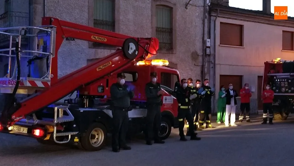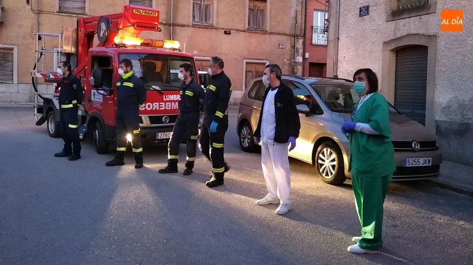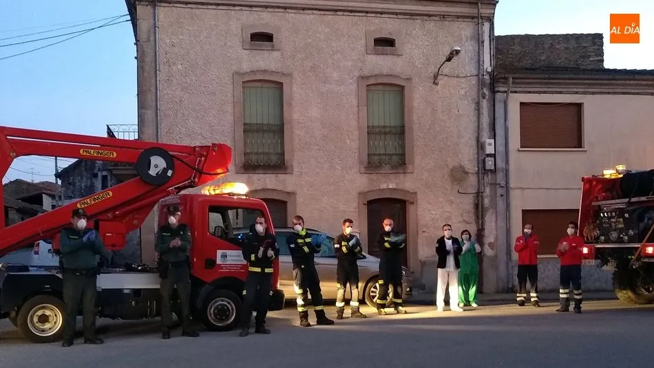 Los Bomberos del Parque de Lumbrales, la Guardia Civil y los sanitarios de guardia en el centro de salud de la capital del Abadengo se han congregado esta tarde a la puerta del consultorio para sumarse al momento de los aplausos de reconocimeinto a estos colectivos que los vecinos de la villa, al igual que los de todos los pueblos y ciudades de la geografía española, vienen efectuando cada día a las 20,00 horas.