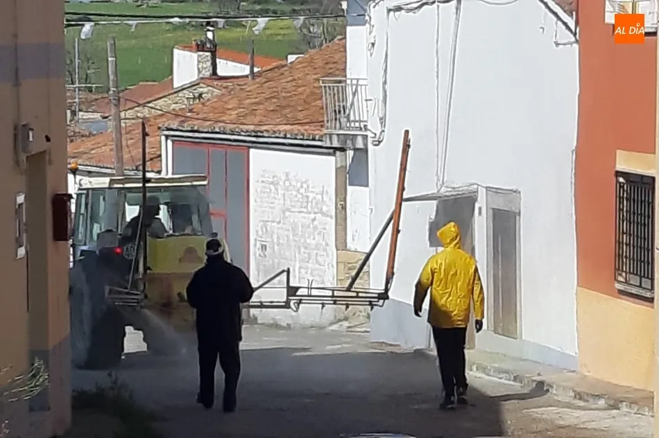 Con ayuda de algunos agricultores, y sumándose a la iniciativa de la Diputación, el Ayuntamiento de Cabeza del Caballo procede a la desinfección de las calles de esta localidad y de Fuentes de Masueco, población perteneciente a este municipio y a la que le llegaba el turno este sábado.