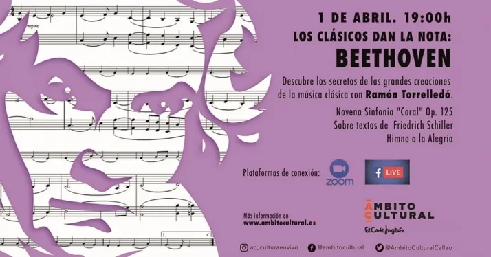 Y el miércoles 1 de abril, ?Los clásicos dan la nota?. Este ciclo estará dirigido por el director de orquesta Ramón Torrelledó. Las grandes estrellas de la música, Bach, Mozart, Haydn, Beethoven, Schubert, Schumann, Chopin Liszt, Wagner, Verdi, Bruckner, Mahler, Schoenberg, Puccini, y tantos otros, se podrán disfrutar en Zoom y en Facebook Live de Ámbito Cultural. Unas obras que discurren por senderos procelosos, a los que es posible acceder, en plenitud, si previamente uno se ha ?empapado? de las claves esenciales que nos permitan leer el mapa técnico, emocional e histórico del recorrido, seguido por el compositor en su creación, para alcanzar a disfrutar y conocer las potencialidades que la obra maestra ofrece. Para ello, Ámbito Cultural de El Corte Inglés comienza este ciclo musical, estético, formativo, informativo y divulgativo, destinado a aportar, desde el rigor y el placer, claves esenciales de las grandes páginas de la música clásica, con Beethoven. Para más información: https://ambitocultural.es/beethoven-ramon-torrelledo-clasicos-online-85414/
