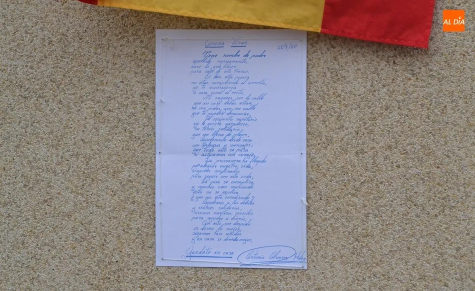 Lo que ha hecho este vecino es colocar la poesía a la puerta de su vivienda (donde también hay situada una bandera de España que ha hecho su mujer), con la esperanza, eso sí, de que sea leída allí ?por la menor gente posible?, ya que eso sería señal de que se está cumpliendo a rajatabla el confinamiento domiciliario. Para facilitarle la lectura a todo el mundo, reproducimos de forma íntegra esta poesía:
