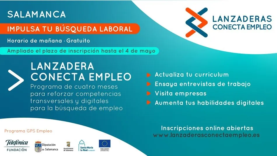 En consonancia con las nuevas fechas, el plazo de inscripción para esta actividad, totalmente gratuita, se amplía hasta el 4 de mayo. Las personas interesadas pueden realizar su inscripción en la página web www.lanzaderasconectaempleo.es.