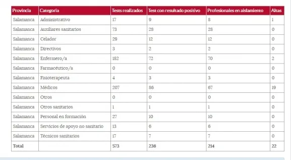 En Salamanca se han realizado un total de 573 pruebas de coronavirus, en las que 236 personas dieron positivo. El tipo de profesional más afectado es el de los médicos (86 positivos), seguido de enfermería (72) y auxiliares sanitarios (28). De todos los infectados, 214 profesionales continúan en aislamiento tras dar positivo en un primer test. Un total de 22 personas han sido dadas de alta tras haberse realizado un segundo test y haber dado negativo.