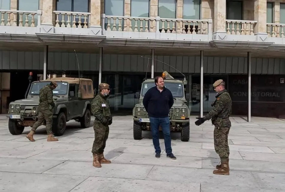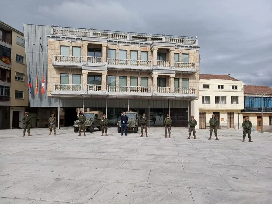 El Ejército Español está presente en Guijuelo en los últimos días realizando tareas de control y prevención de la Operación Balmis, el despliegue de tropas en todo el país velando por el Estado de Alarma y colaborando en la lucha contra la pandemia del coronavirus. En concreto han sido dos unidades, la primera de ellas es la Unidad Militar de Emergencias, la UME, que ha estado esta mañana realizando tareas de desinfección en el centro de salud de la villa. Por otro lado, efectivos del Regimiento nº 11 de Ingenieros de Salamanca realizan tareas de vigilancia del Estado de Alarma en las calles de la villa. El Ayuntamiento de Guijuelo ha recibido a los militares con los brazos abiertos y el propio alcalde, Roberto Martín, les ha hecho entrega de un presente acompañado del jefe de la Policía Local, Clemente Iglesias.
