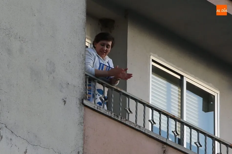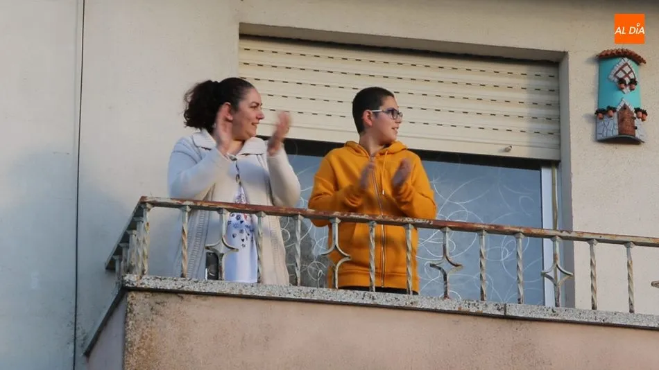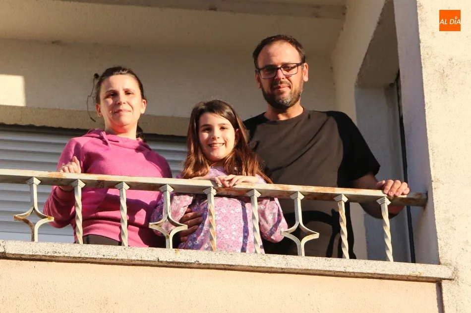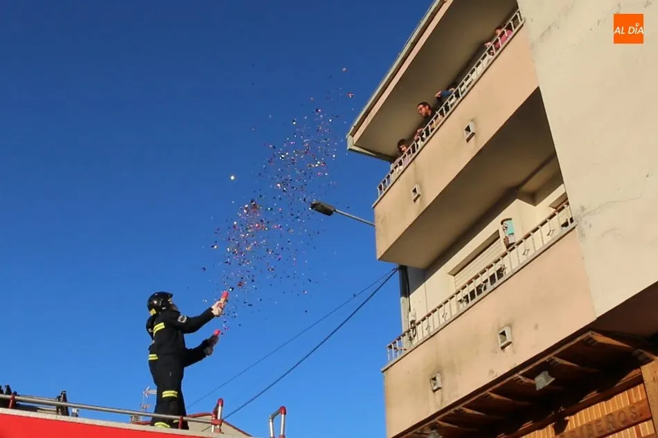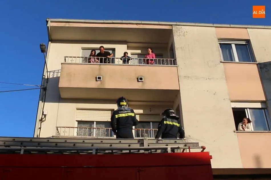 Con cara de gran alegría, Ana aparecía en el balcón de su casa acompañada de su hermano y sus padres, desde donde saludó a los integrantes del Cuerpo de Bomberos de Vitigudino, que un día más desempeñaban una gran labor social dando ánimos a los valientes más pequeños de esta pandemia tras permanecer confinados en sus casas.