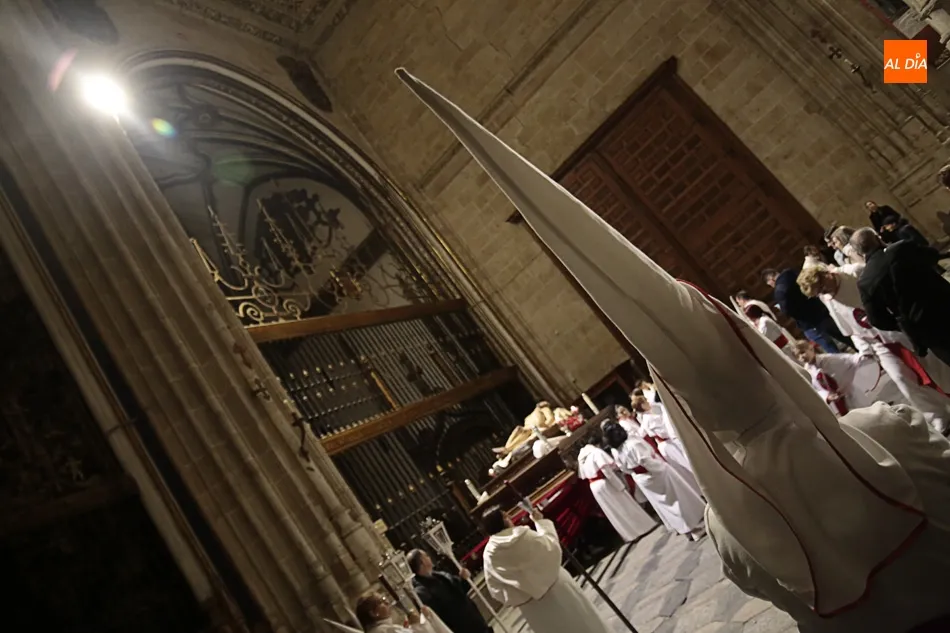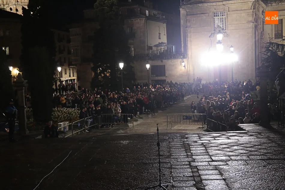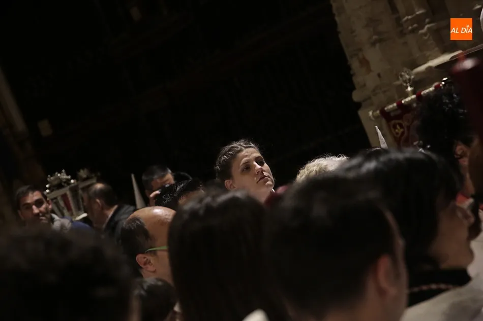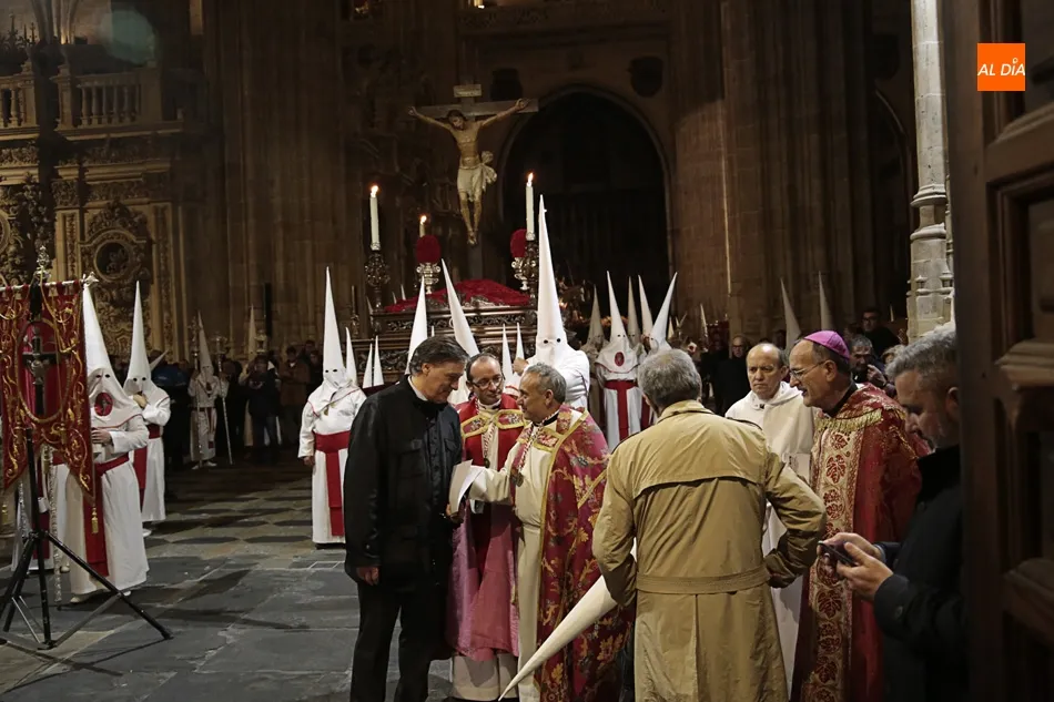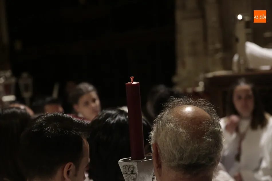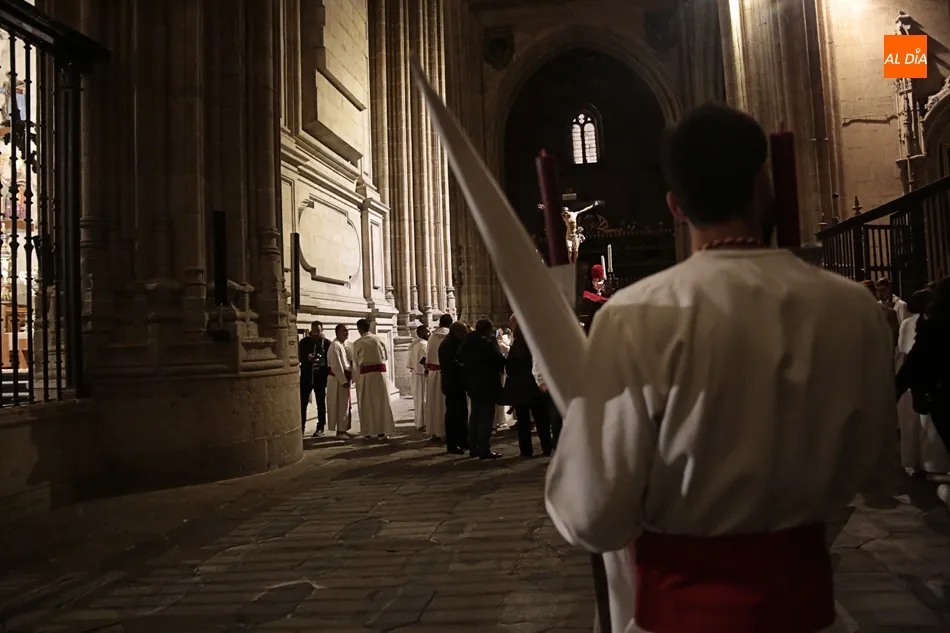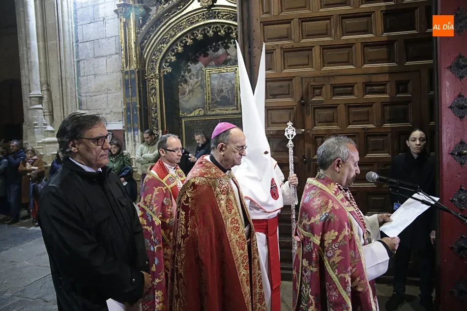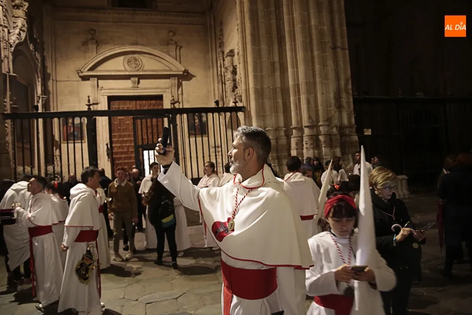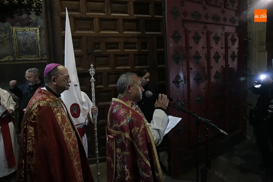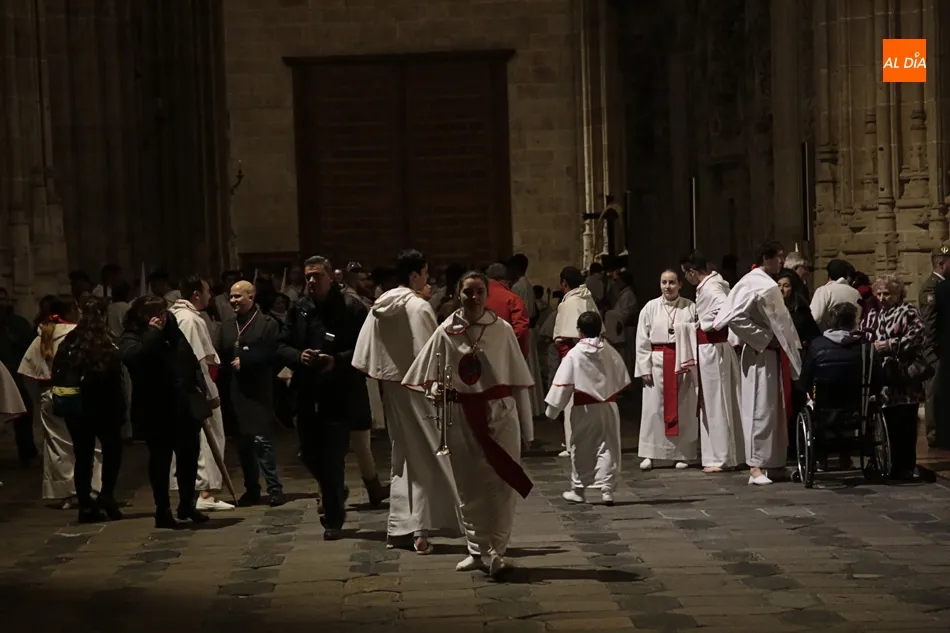 Miércoles Santo sin procesiones por la lluvia. La Real Cofradía Penitencial del Cristo Yacente de la Misericordia y de la Agonía Redentora tampoco han podido salir esta media noche por las calles del casco histórico de Salamanca. Cientos de personas esperaban la salida de los pasos que, finalmente, han permanecido en el interior de la Catedral. Tanto la Promesa del Silencio, en la que ha participado el alcalde de Salamanca, Carlos García Carbayo, como el Vía Crucis, se han celebrado dentro.