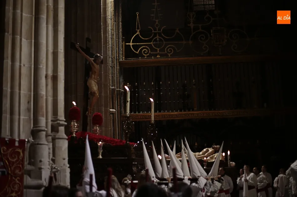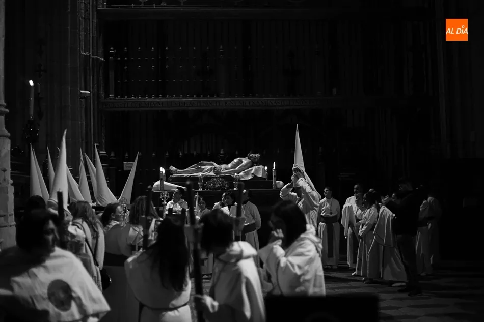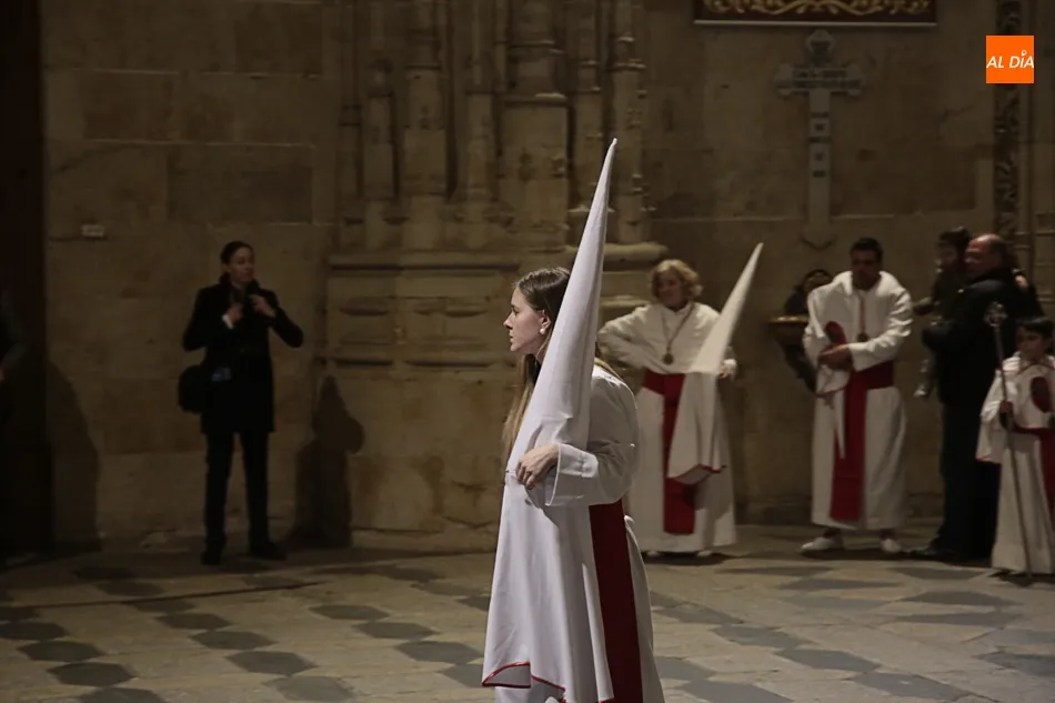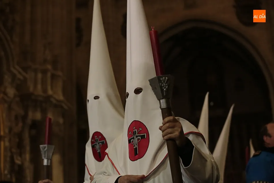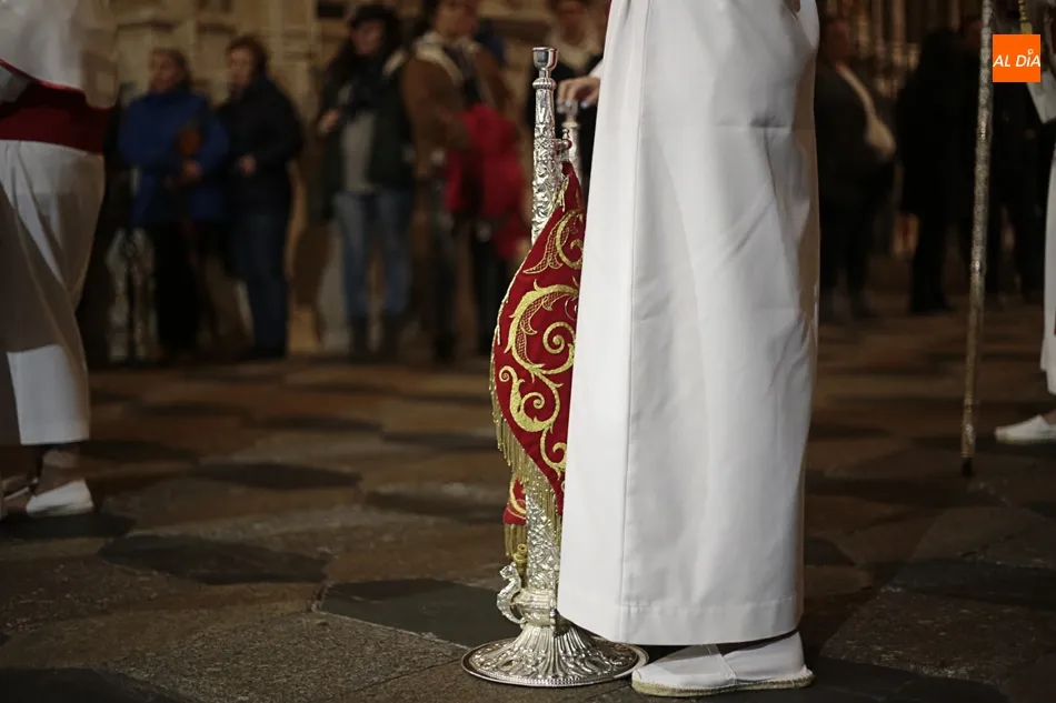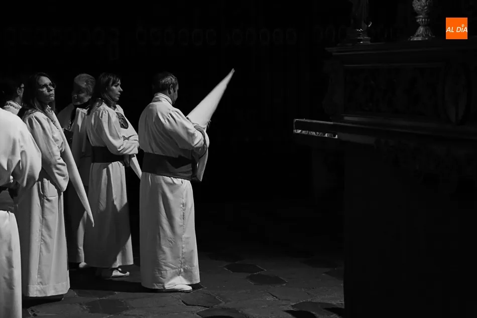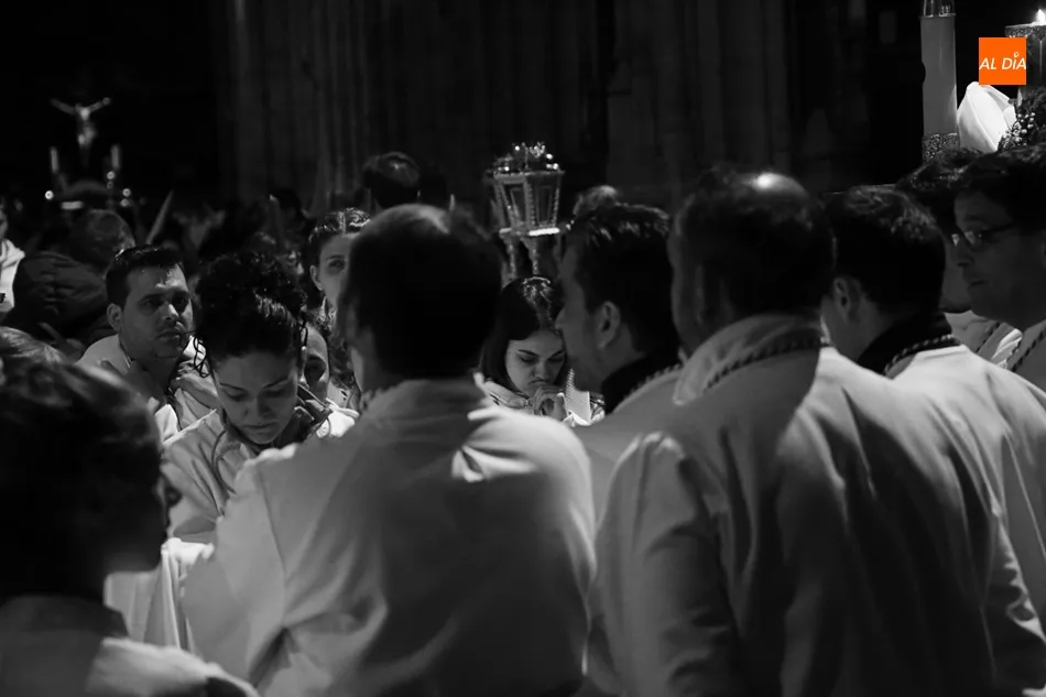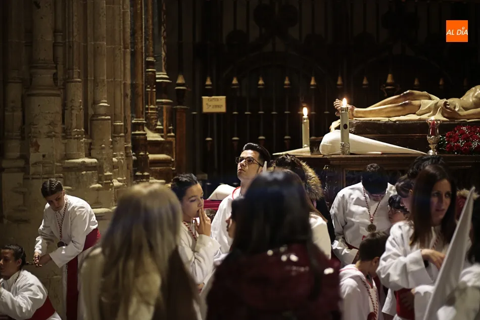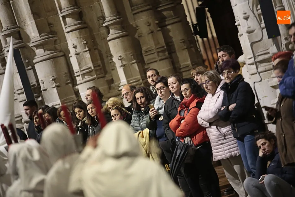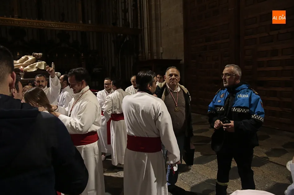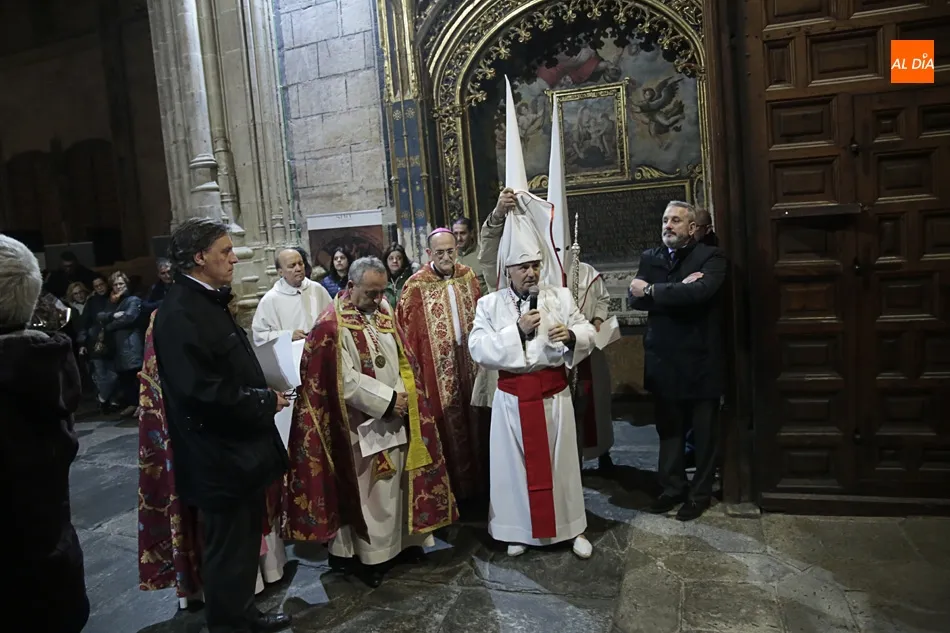 Miércoles Santo sin procesiones por la lluvia. La Real Cofradía Penitencial del Cristo Yacente de la Misericordia y de la Agonía Redentora tampoco han podido salir esta media noche por las calles del casco histórico de Salamanca. Cientos de personas esperaban la salida de los pasos que, finalmente, han permanecido en el interior de la Catedral. Tanto la Promesa del Silencio, en la que ha participado el alcalde de Salamanca, Carlos García Carbayo, como el Vía Crucis, se han celebrado dentro.
