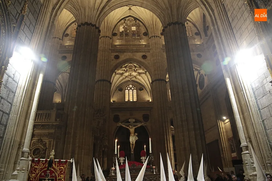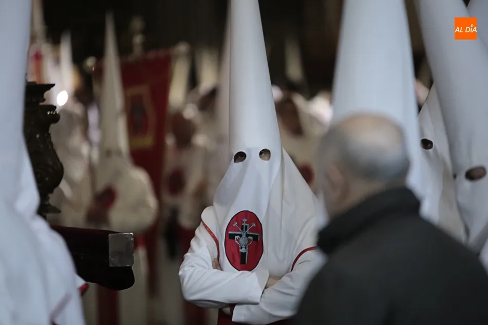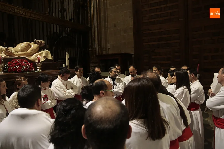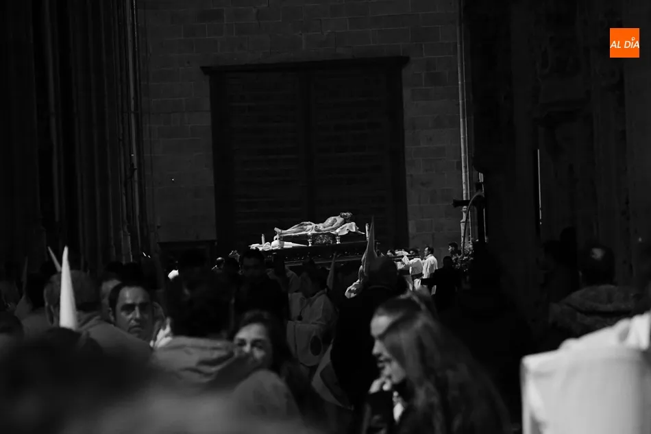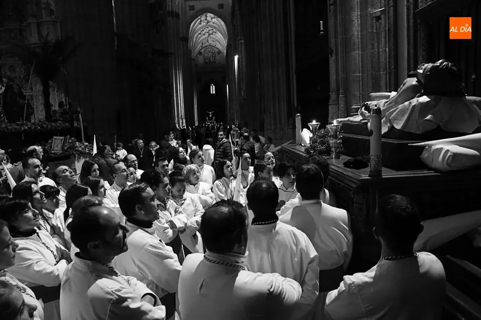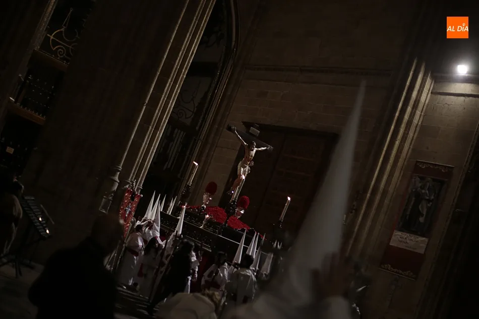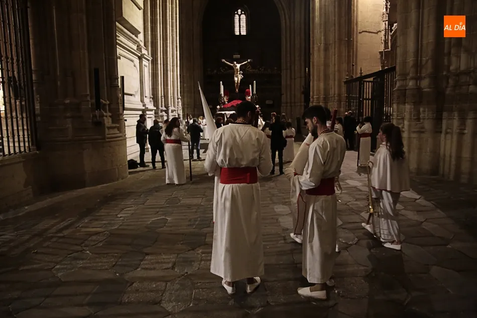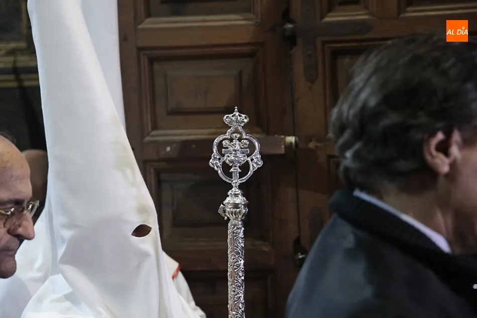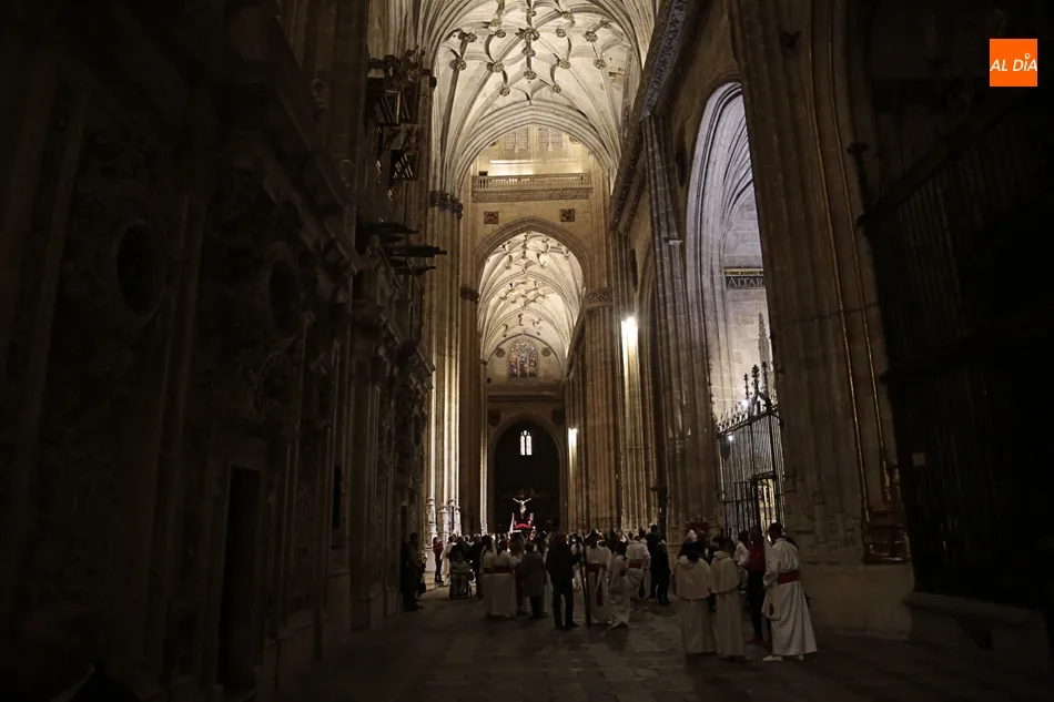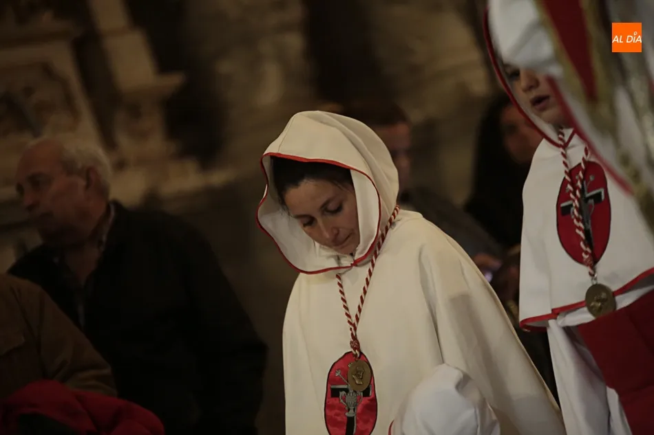 Miércoles Santo sin procesiones por la lluvia. La Real Cofradía Penitencial del Cristo Yacente de la Misericordia y de la Agonía Redentora tampoco han podido salir esta media noche por las calles del casco histórico de Salamanca. Cientos de personas esperaban la salida de los pasos que, finalmente, han permanecido en el interior de la Catedral. Tanto la Promesa del Silencio, en la que ha participado el alcalde de Salamanca, Carlos García Carbayo, como el Vía Crucis, se han celebrado dentro.