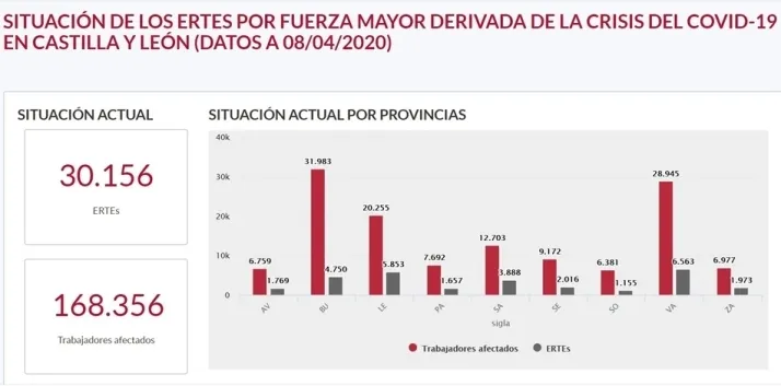 Las solicitudes de expedientes de regulación temporal de empleo (ERTE) en Castilla y León suman 30.156 (30.118 ante la Junta y 38 ante el Ministerio de Trabajo y Economía Social), con 168.356 trabajadores potencialmente afectados (167.804 y 552 respectivamente), según los datos facilitados este miércoles por el Ejecutivo autonómico.