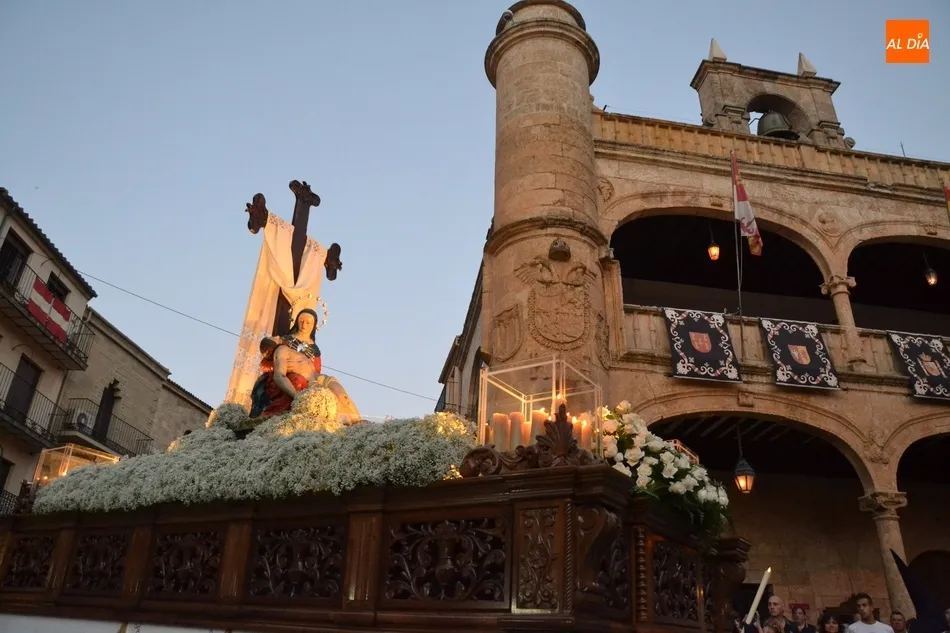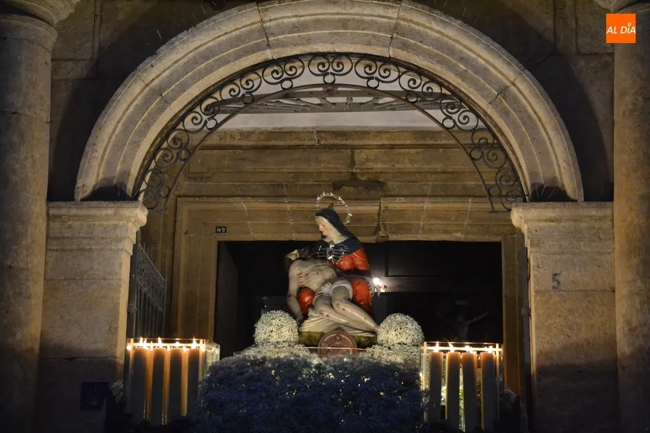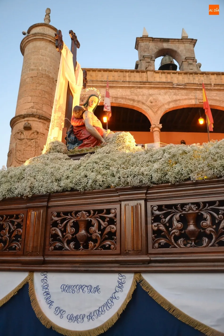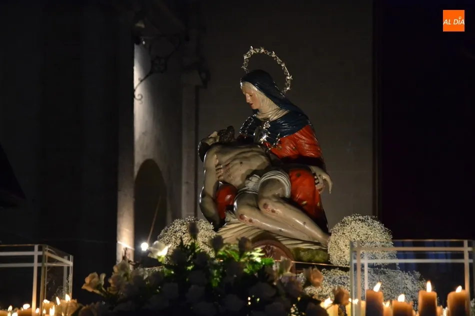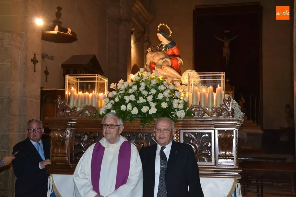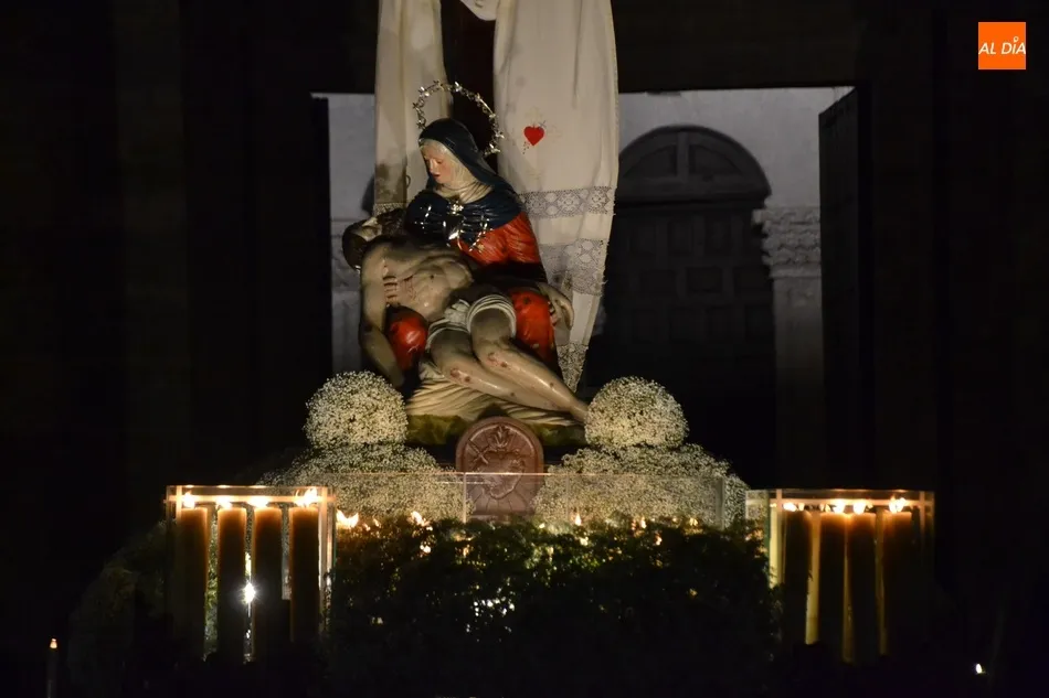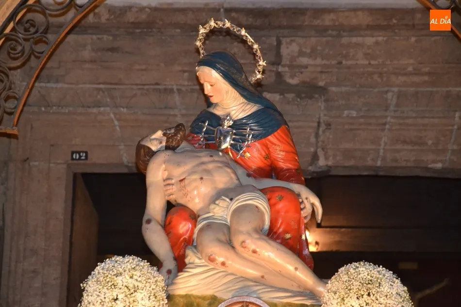 En aquel mismo pregón, Feliciano Sierro Malmierca apuntó que ?lo más probable? es que la imagen de la Virgen de las Angustias procediese del Convento de San Francisco, donde tenía su asiento la Cofradía de la Piedad. Lo que se sabe de la imagen es que es una escultura del siglo XVIII, apuntando Isidro Pérez Rodríguez (a partir de unos datos encontrados en un catálogo de una muestra del Museo Nacional de Escultura) que podría ser una Virgen realizada por José Larra Domínguez en 1729 por encargo de un canónigo de Ciudad Rodrigo.