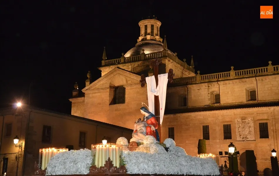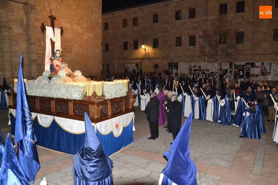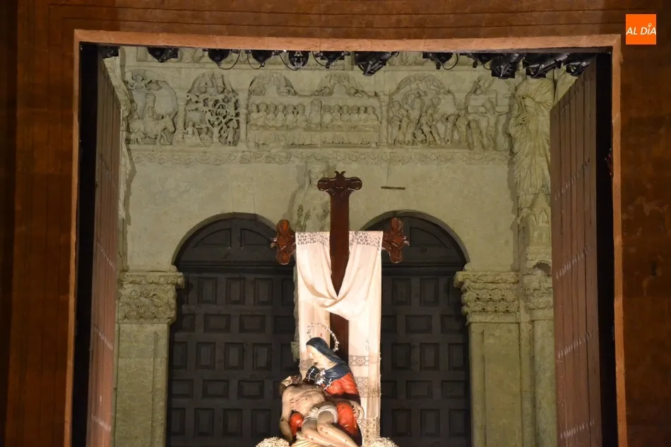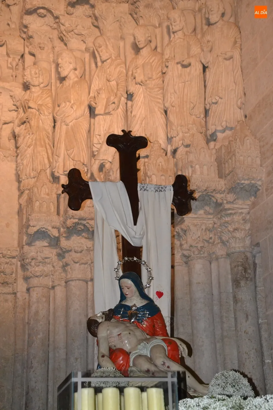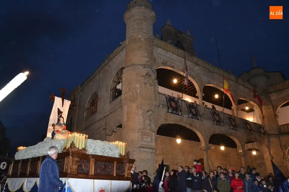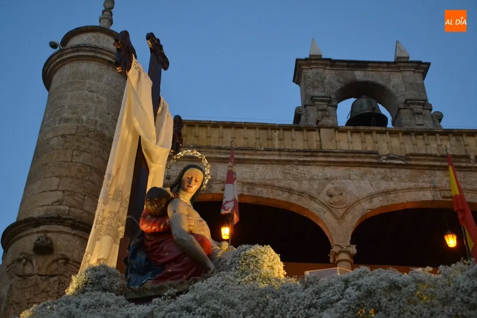 En aquel mismo pregón, Feliciano Sierro Malmierca apuntó que ?lo más probable? es que la imagen de la Virgen de las Angustias procediese del Convento de San Francisco, donde tenía su asiento la Cofradía de la Piedad. Lo que se sabe de la imagen es que es una escultura del siglo XVIII, apuntando Isidro Pérez Rodríguez (a partir de unos datos encontrados en un catálogo de una muestra del Museo Nacional de Escultura) que podría ser una Virgen realizada por José Larra Domínguez en 1729 por encargo de un canónigo de Ciudad Rodrigo.