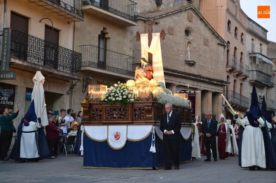 Aunque se viene dando como fecha de referencia que participa en la procesión del Santo Entierro desde 1892, Feliciano Sierro Malmierca, en su Pregón de la Semana Santa de 1995, expuso que en 1864 ya tomaría parte en ese desfile, que era el único que se organizaba en aquel momento. Según explicó, la procesión del Santo Entierro se iniciaba saliendo de la Tercera Orden las imágenes del Ecce Homo y la Virgen de las Angustias (que se guardaban allí), en dirección a la Catedral, donde se reunían con el Santo Sepulcro y la Virgen de la Soledad (que salían por la Puerta de las Cadenas de la Seo) para procesionar por varias calles.