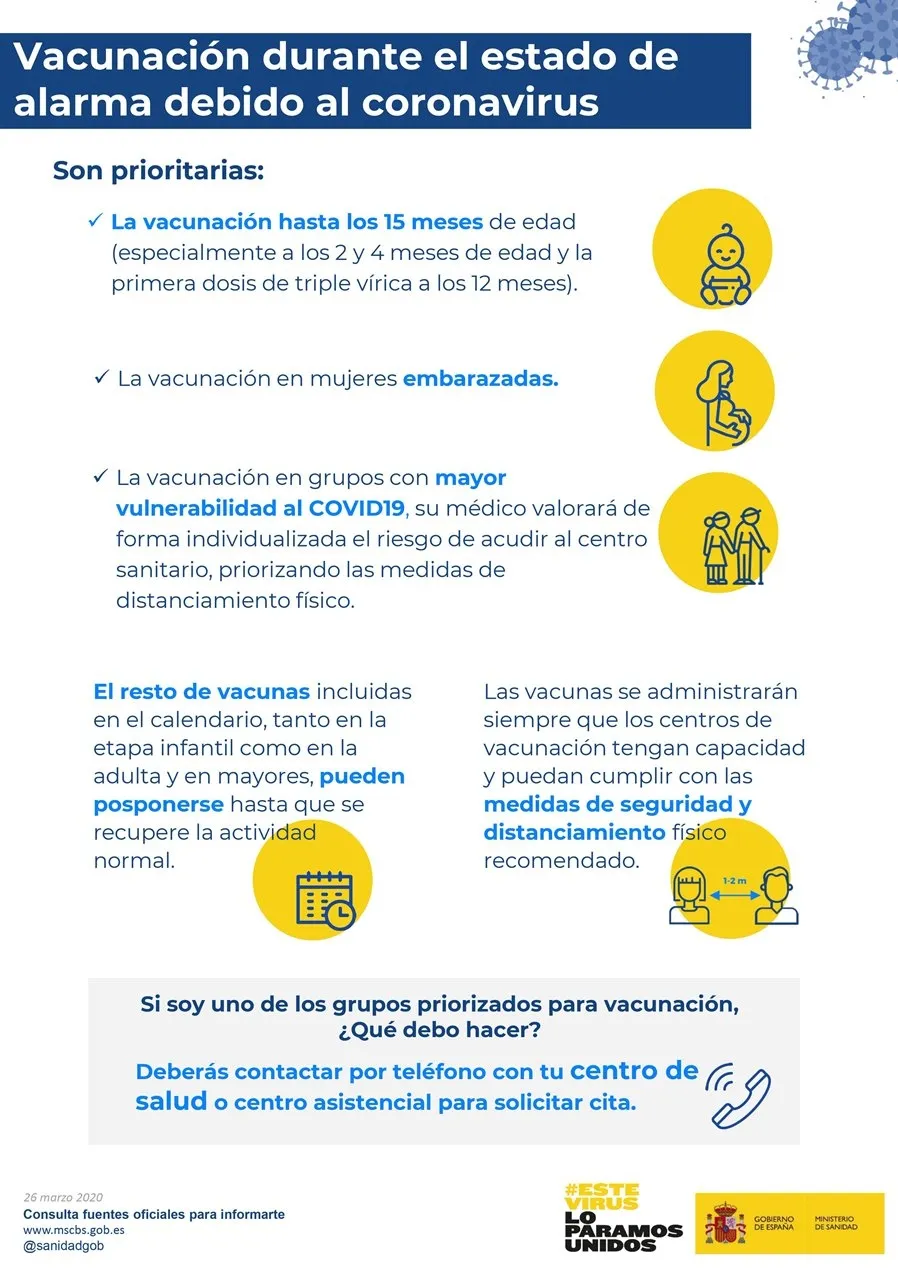 El resto de vacunas incluidas en el calendario, tanto en la etapa infantil como en la adulta y en mayores se posponen hasta nueva indicación.
