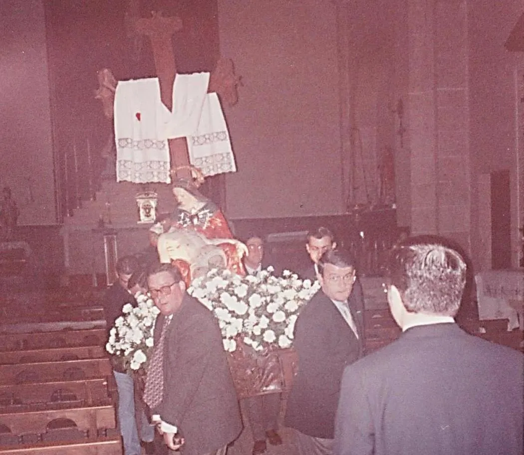 En el momento de su fundación, y a pesar de ser una hermandad exclusivamente femenina, la cofradía decide contar con los portadores que llevaban varios años siendo los encargados de sacar en procesión la Santa imagen de la Virgen de las Angustias, a instancia del sacerdote encargado de la iglesia de las Tercera Orden don Estanislao López. Este grupo de amigos estaba formado inicialmente por Joaquín Sánchez ?Tato?, Chema Esteban ?Rodeo?, Manolo Dorado y Antonio Vasconcellos; a los que posteriormente se les unieron otros afines como Antonio Cantarinas y Tino. Todos ellos fueron los encargados de llevar sobre sus hombros a la Virgen de las Angustias durante muchos años, siendo relevados con el tiempo en esta gran labor por sus hijos, sobrinos y allegados. En actualidad la Virgen es llevada en rica carroza tallada en madera.