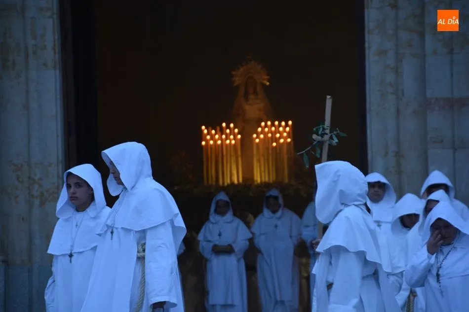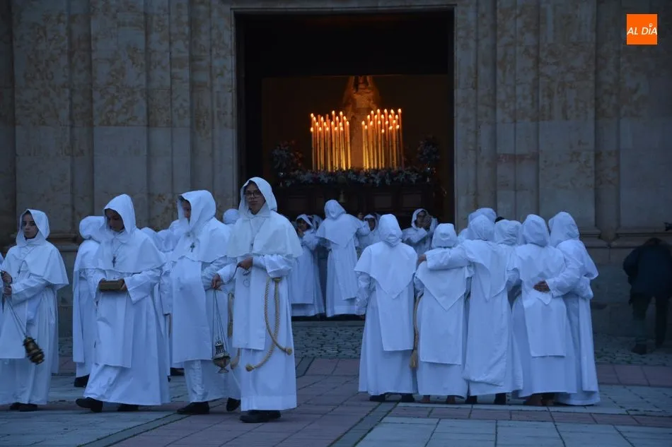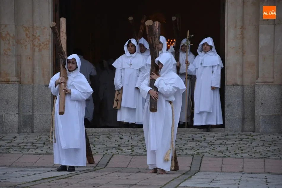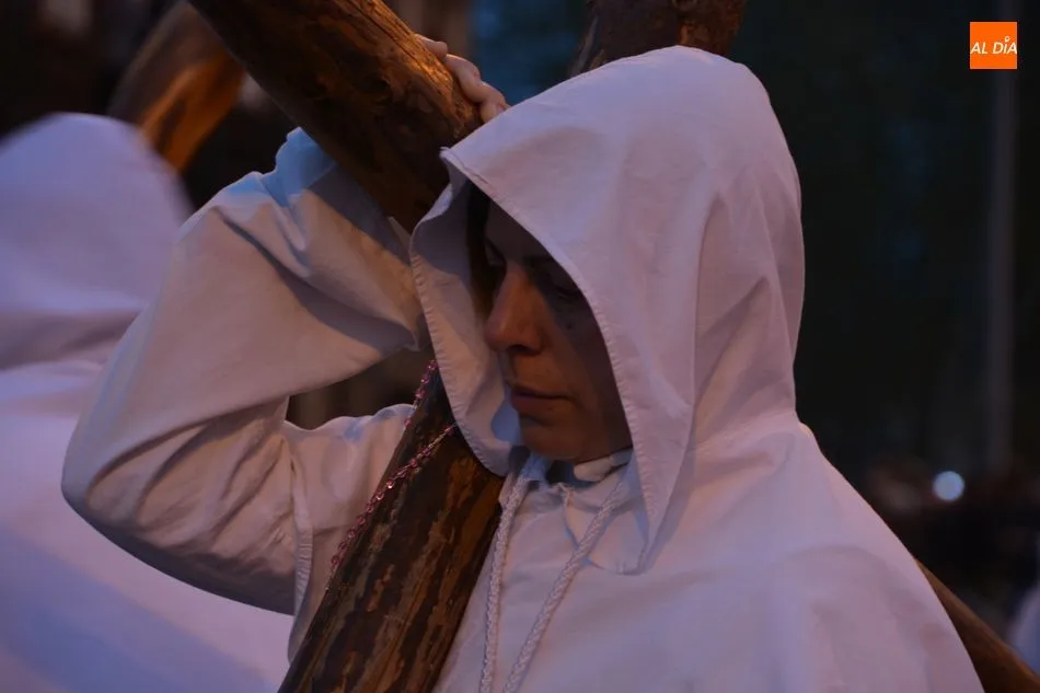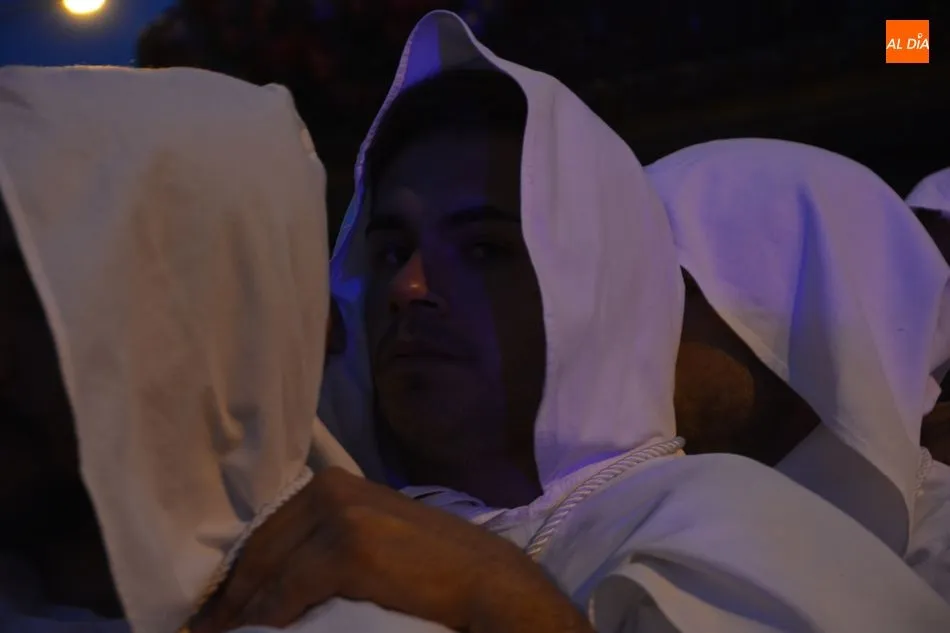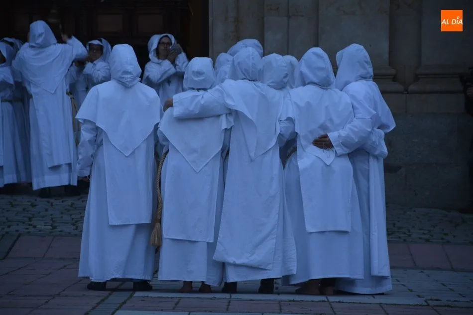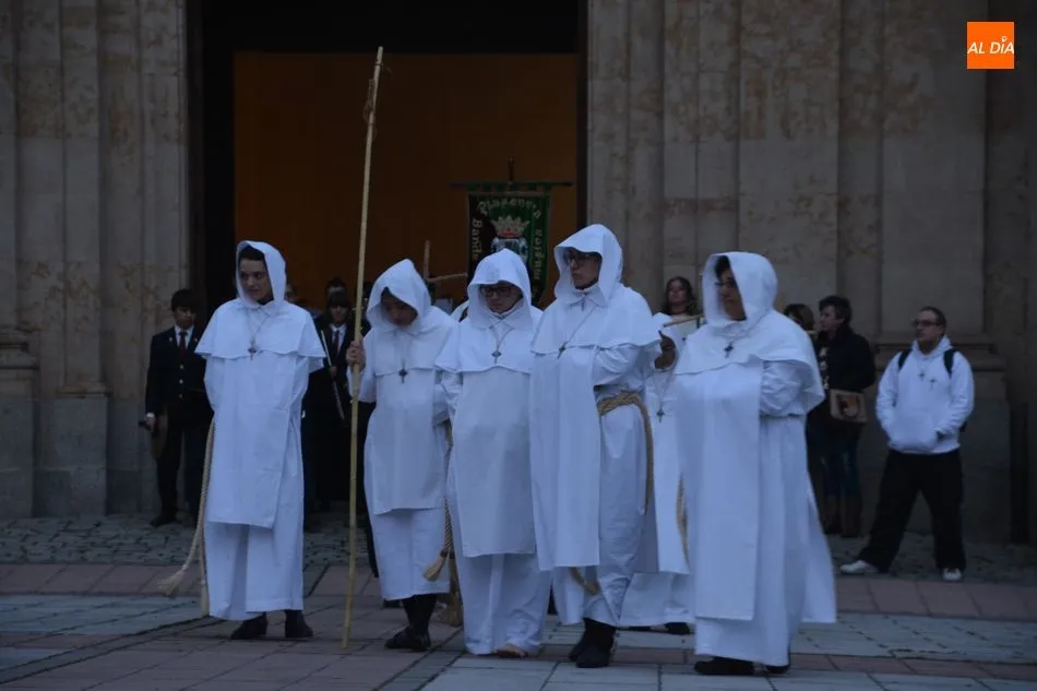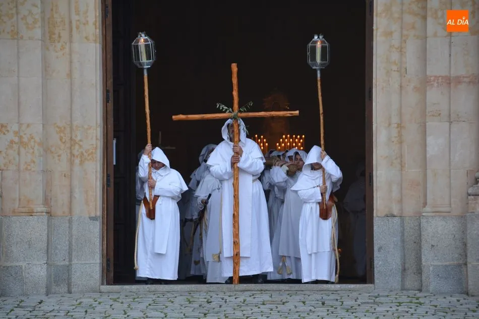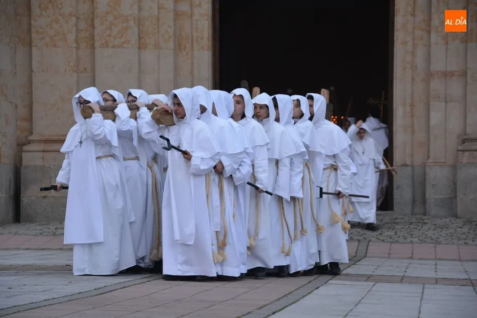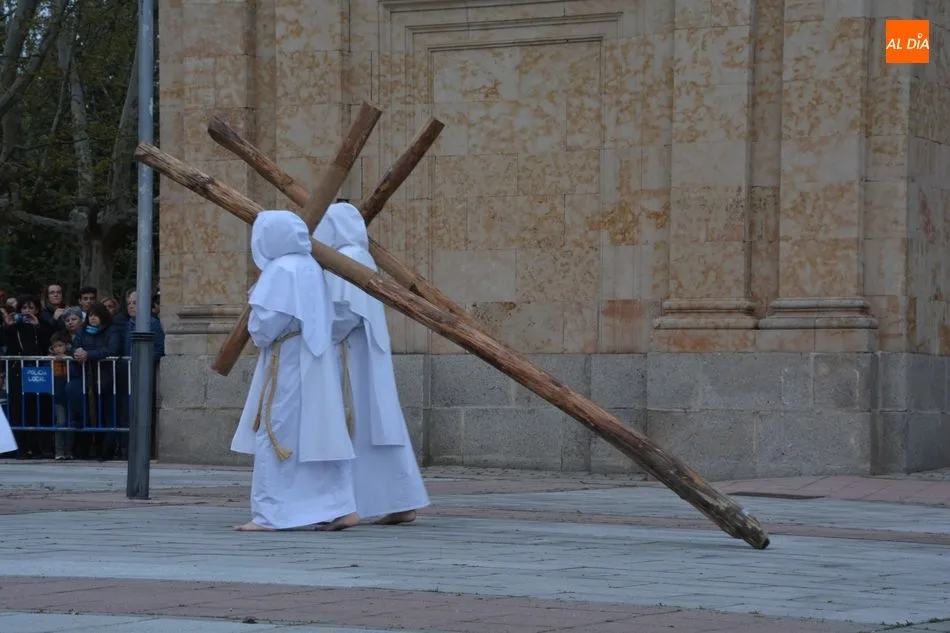 En esta procesión de Jueves Santos, los hermanos visten hábito blanco de tipo monacal, con escapulario y capucha, ceñido a la cintura con soga de esparto y se completa el hábito con el emblema de la hermandad, cruz y dos ramas de olivo, en plata a modo de medalla. El hecho de salir a cara descubierta empleando capucha en lugar de capirote se debe al espíritu fundacional de la Hermandad y las adversidades a que se enfrentaba la Semana Santa salmantina en los años 70, ante las que se decidió que era necesario dar la cara.
