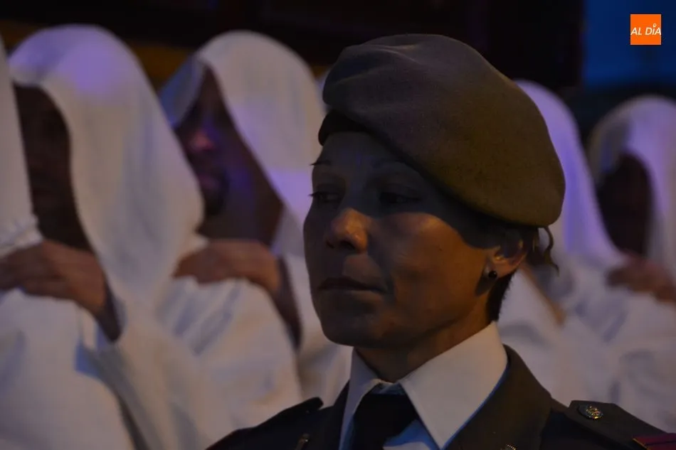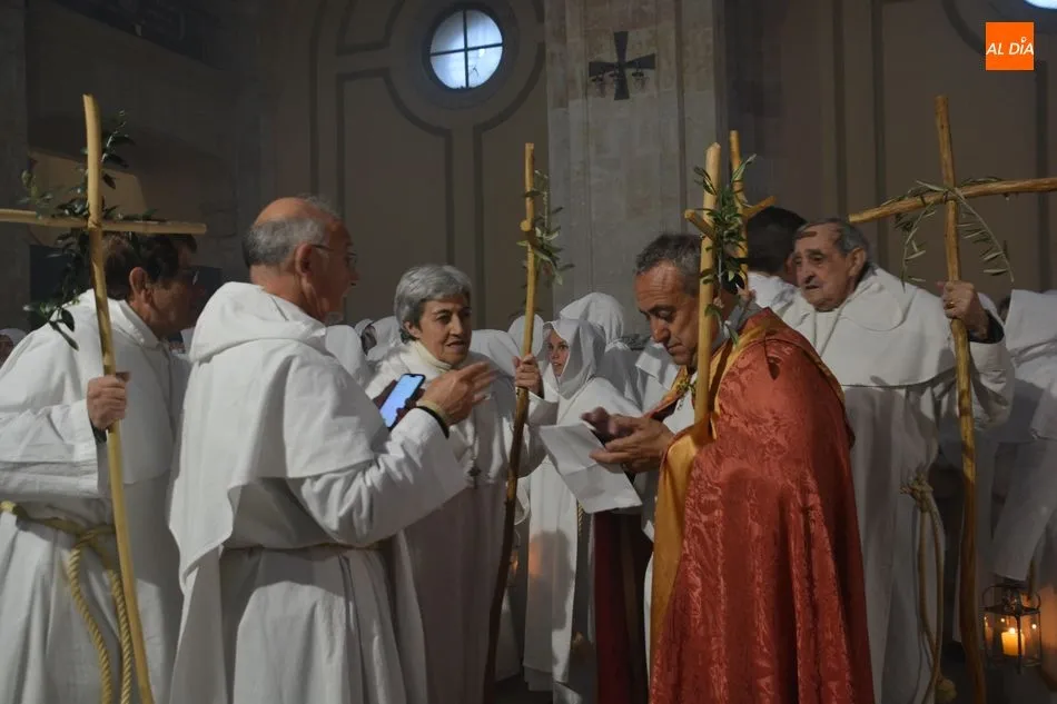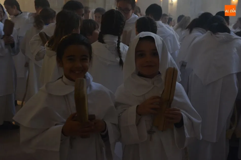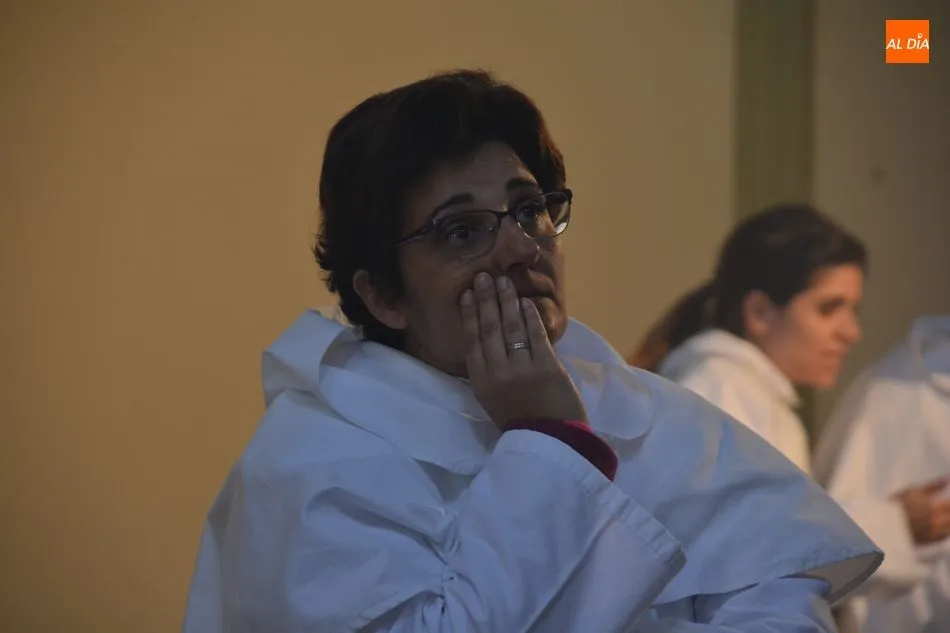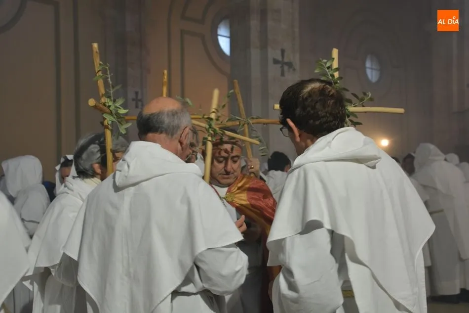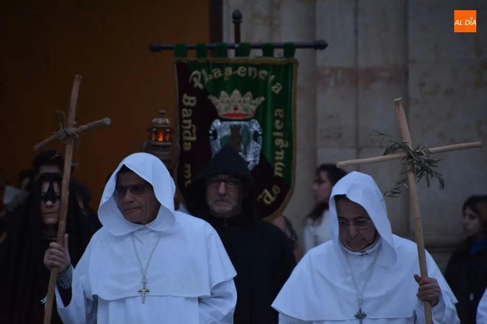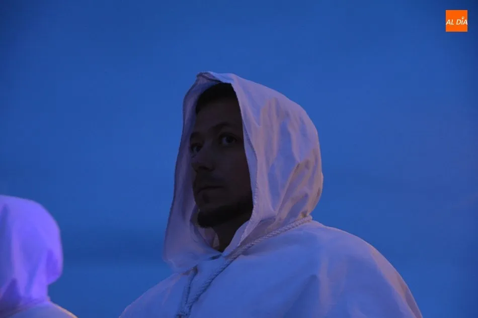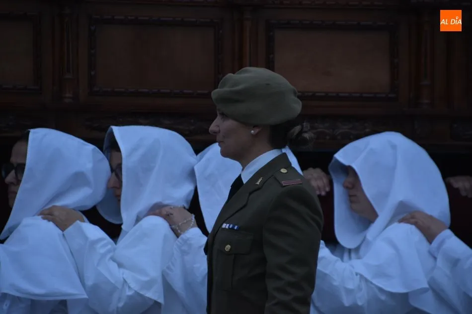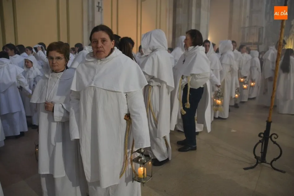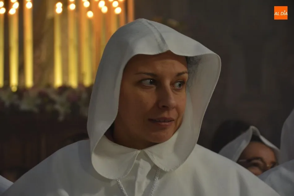 En esta procesión de Jueves Santos, los hermanos visten hábito blanco de tipo monacal, con escapulario y capucha, ceñido a la cintura con soga de esparto y se completa el hábito con el emblema de la hermandad, cruz y dos ramas de olivo, en plata a modo de medalla. El hecho de salir a cara descubierta empleando capucha en lugar de capirote se debe al espíritu fundacional de la Hermandad y las adversidades a que se enfrentaba la Semana Santa salmantina en los años 70, ante las que se decidió que era necesario dar la cara.
