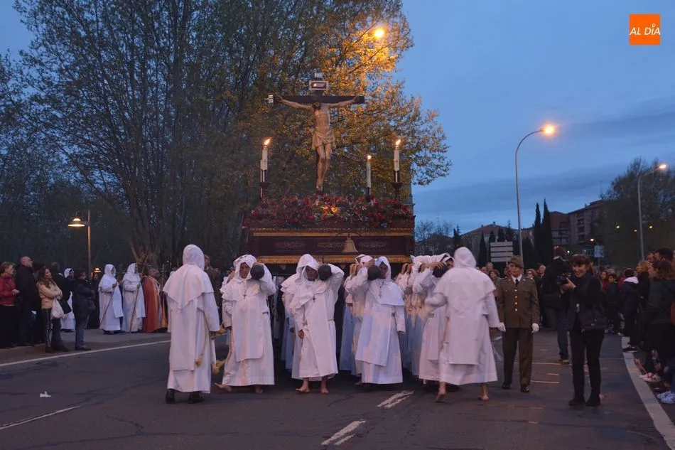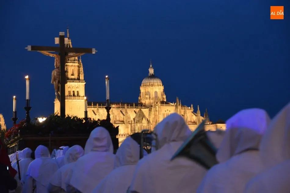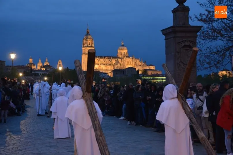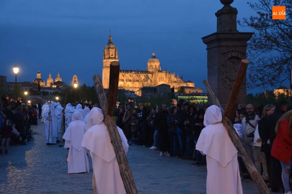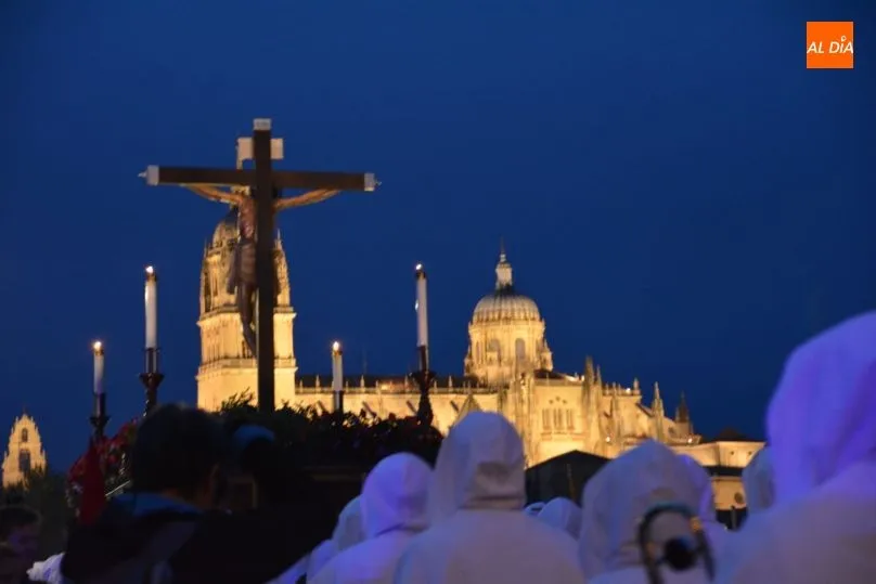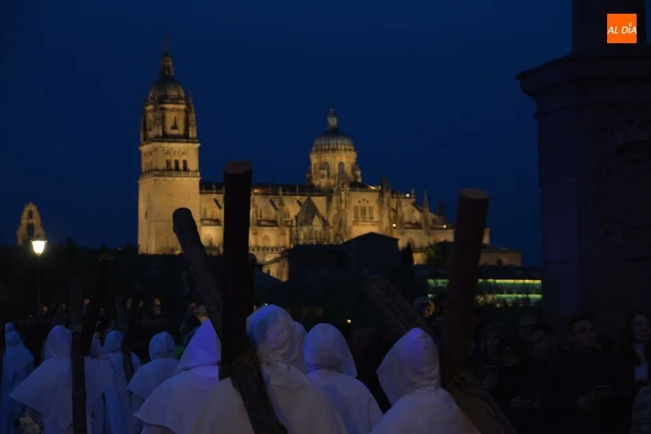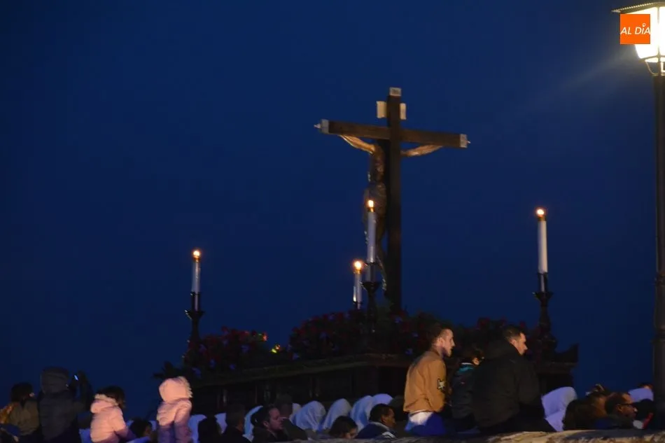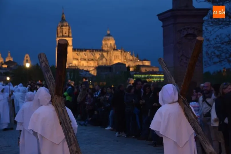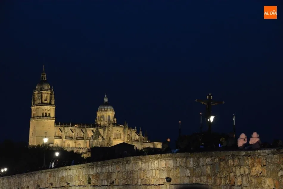 Con salida desde El Arrabal, pese al mal tiempo, numeroso público esperaba en el Puente Romano y proximidades para presenciar la subida espectacular por la empinada cuesta de la Calle Tentenecio, con el incienso, los faroles encendidos y la larga hilera de cruces. Sin embargo, el Cristo del Amor y de la Paz, junto a María Nuestra Madre, no ha podido atravesar el Tormes para adentrarse en la ciudad en una estampa única en la Semana Santa salmantina.