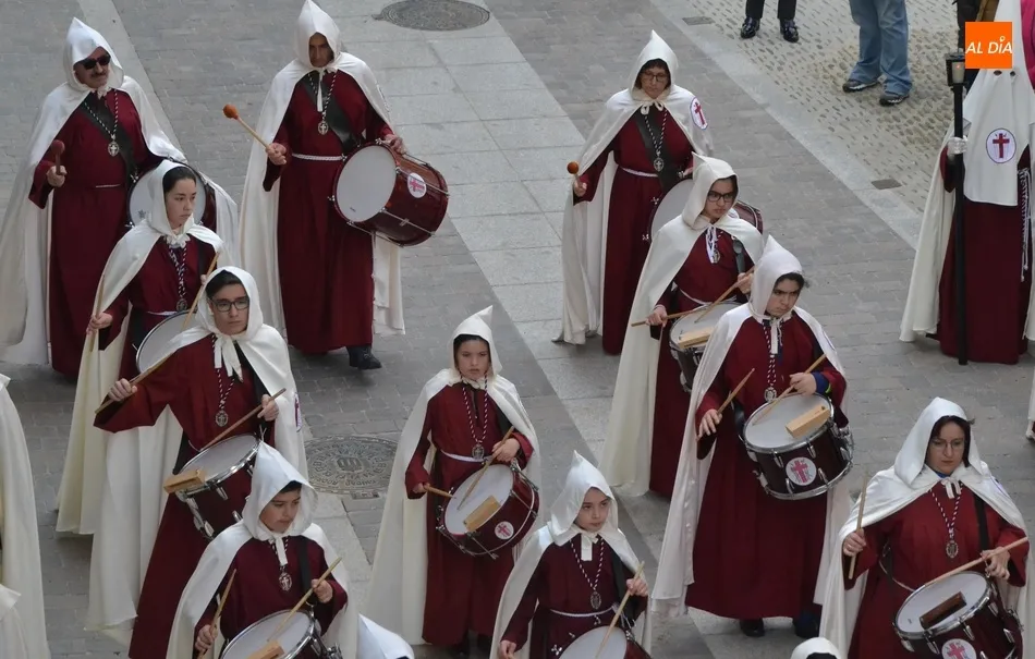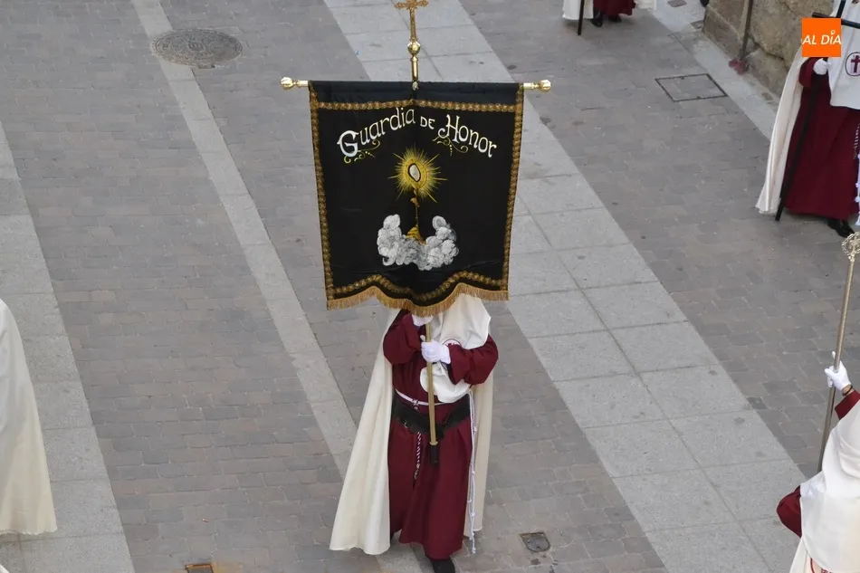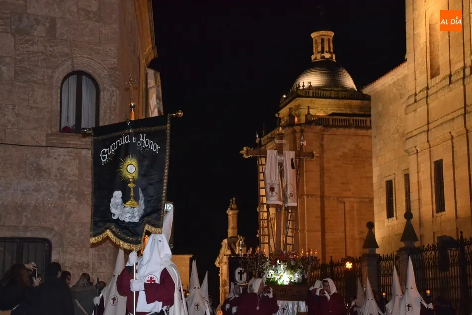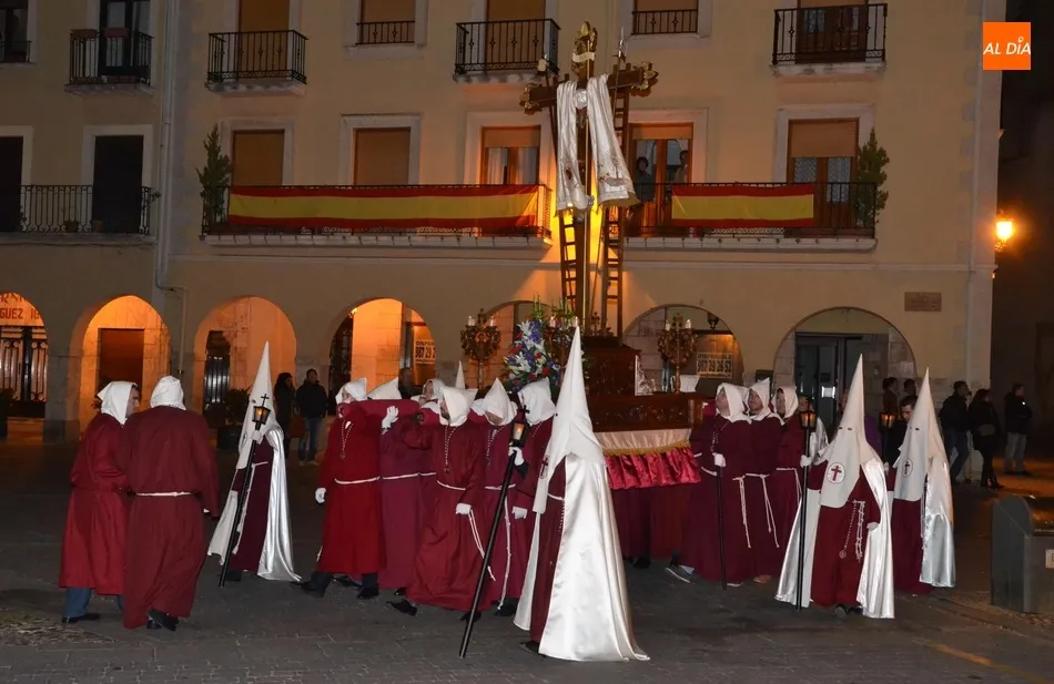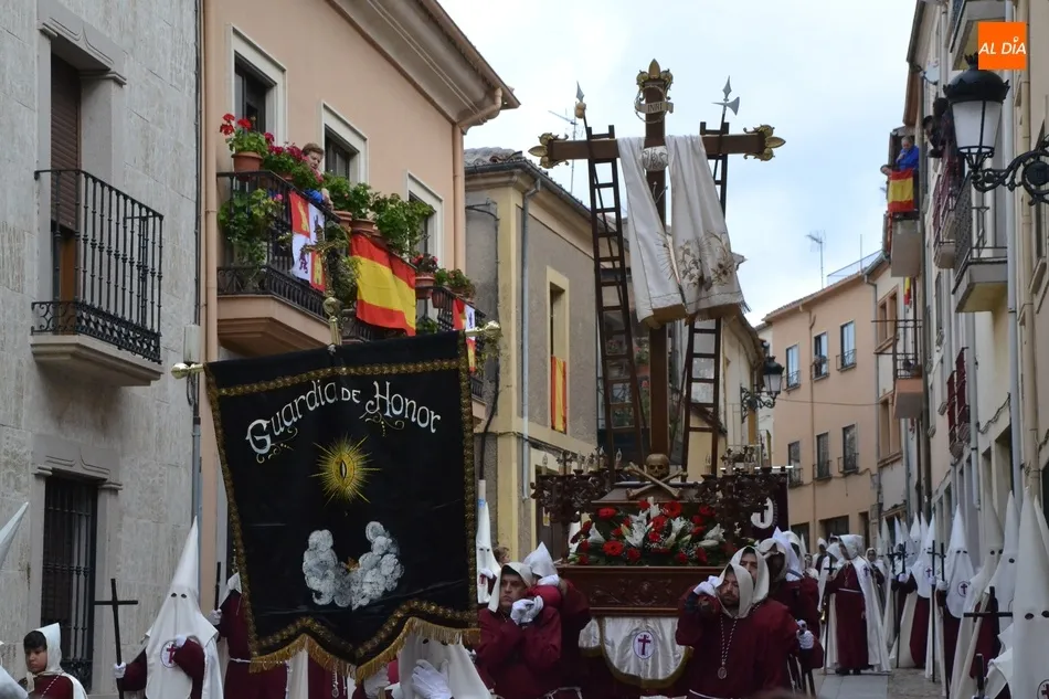 En recuerdo de esos orígenes, la Cofradía de la Santa Cruz incorporó en 2011, un estandarte de ?Guardia de Honor?, que empezó yendo delante del paso de Nuestra Señora de la Cruz, que fue incorporado un año antes. Esa fue la última gran novedad hasta que se decidió el cambio a la mañana del Jueves Santo en busca de un mayor seguimiento de público, ya que en la noche del Miércoles Santo, sobre todo si hacía mal tiempo (o coincidía con partidos de fútbol) había poco seguimiento. Hay que recordar que en su etapa nocturna rezaban el Vía Crucis en la Plaza Mayor.