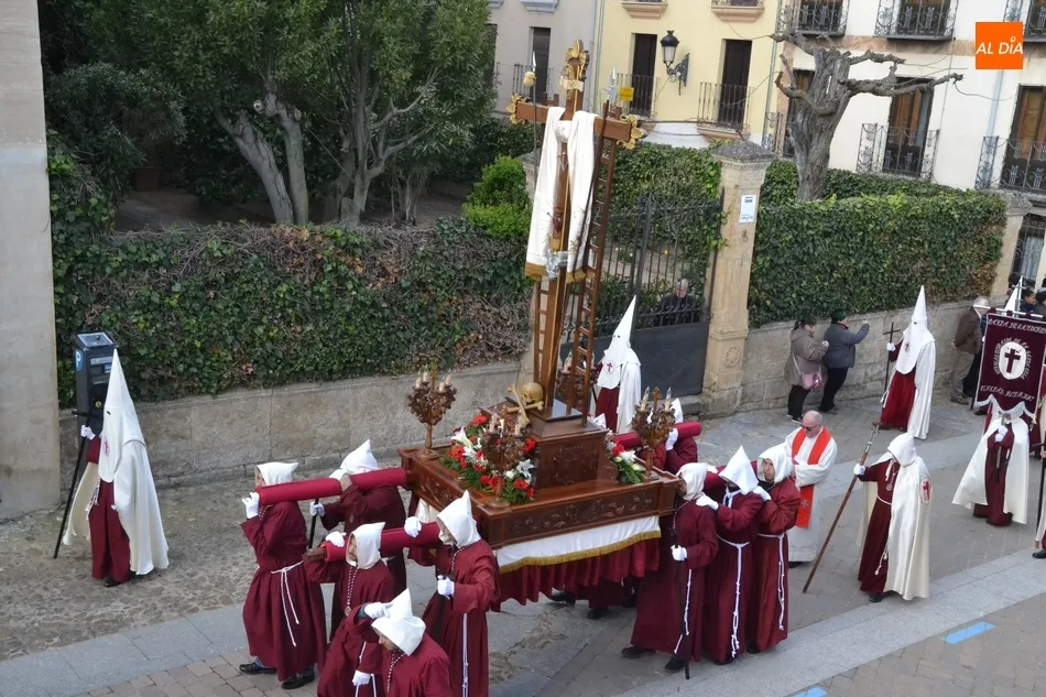 Precisamente, una de las peculiaridades que tenía esta procesión cuando partía de las Carmelitas era que solo salía de allí la Santa Cruz, uniéndose dentro de murallas El Calvario. En torno a este paso, hay que apuntar que la Cofradía lo incorporó en el año 1945 (estaba en la Capilla de la Cárcel y fue llevado a San Agustín), desfilando inicialmente a hombros de varios costaleros (hay imágenes por ejemplo de los años 50 y 60), hasta que se pasó a una carroza, que en 2009 se cambió a una nueva de mayores dimensiones hecha por José Bernal.