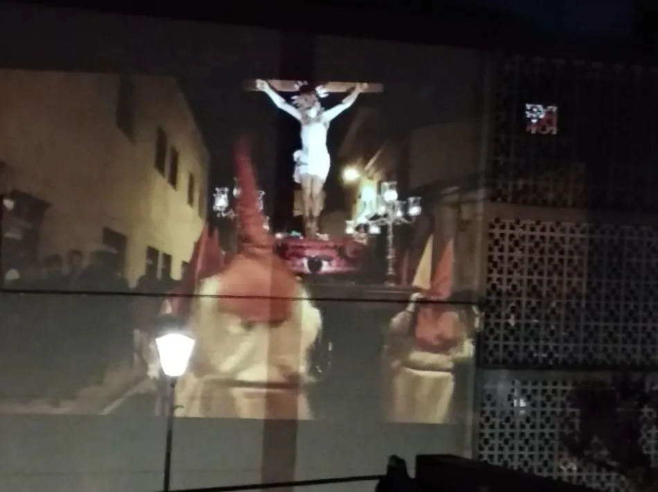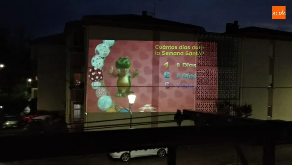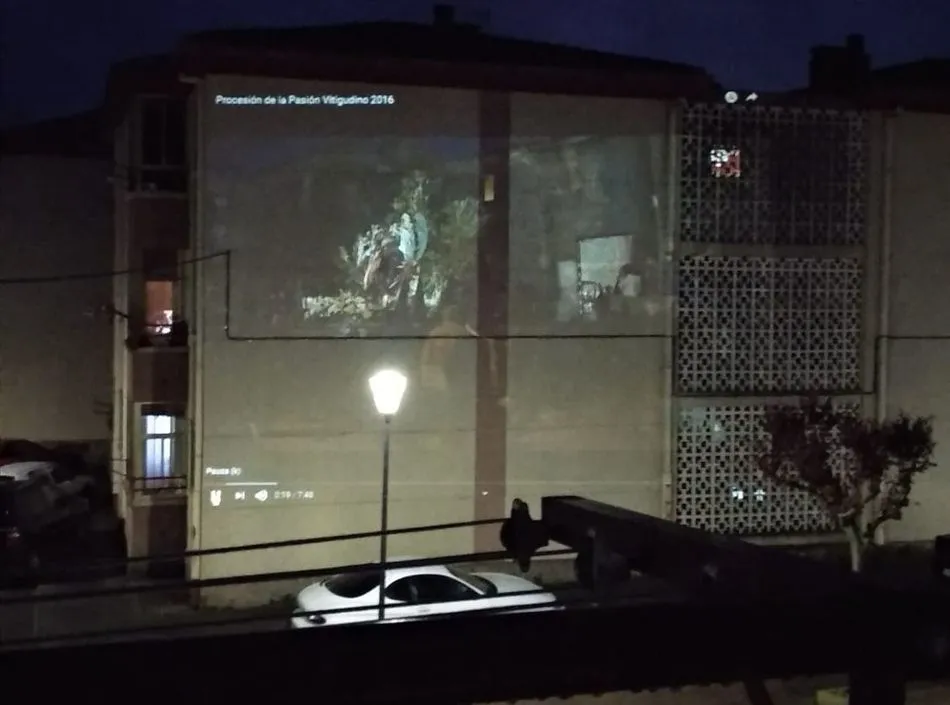 Por tercera noche en lo que llevamos de Pascua, los vecinos de la prolongación de Santa Ana, en Vitigudino, tenían una cita con Tania Bernal, que ante la acogida de días anteriores, proyectaba de nuevo sobre la fachada de enfrente de su balcón cinco vídeos.