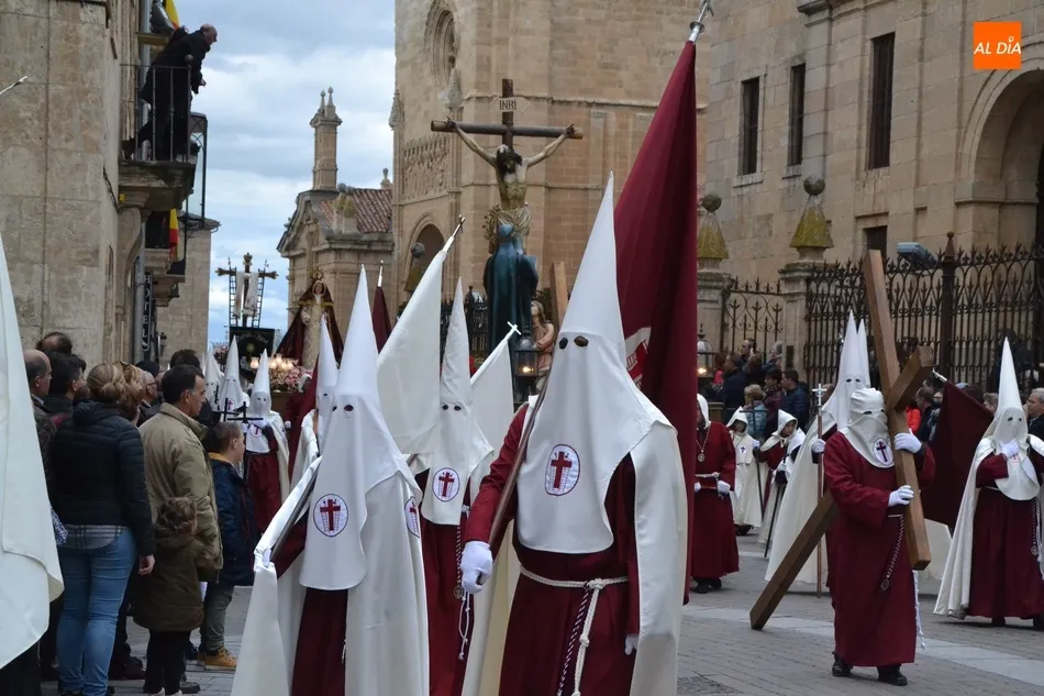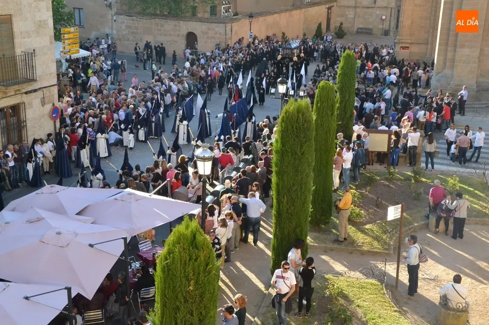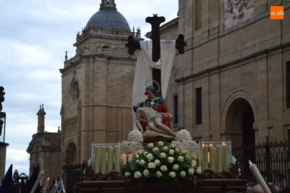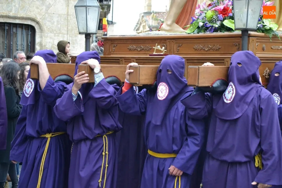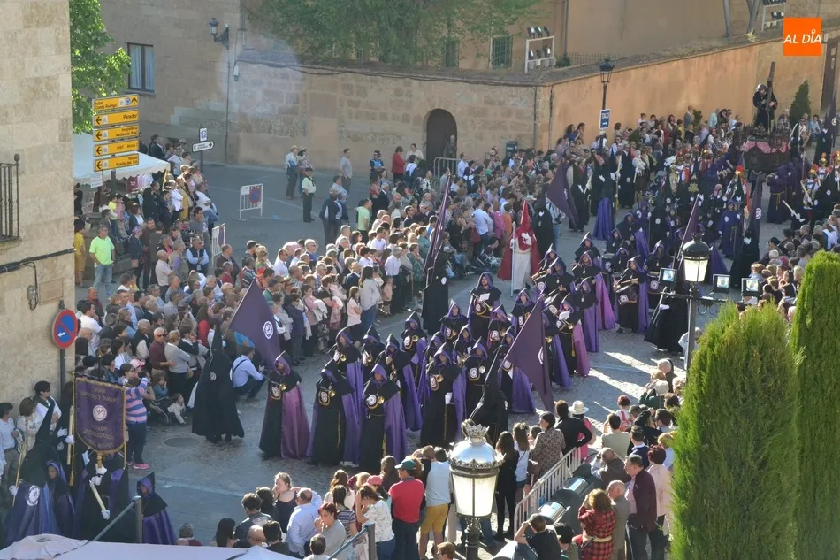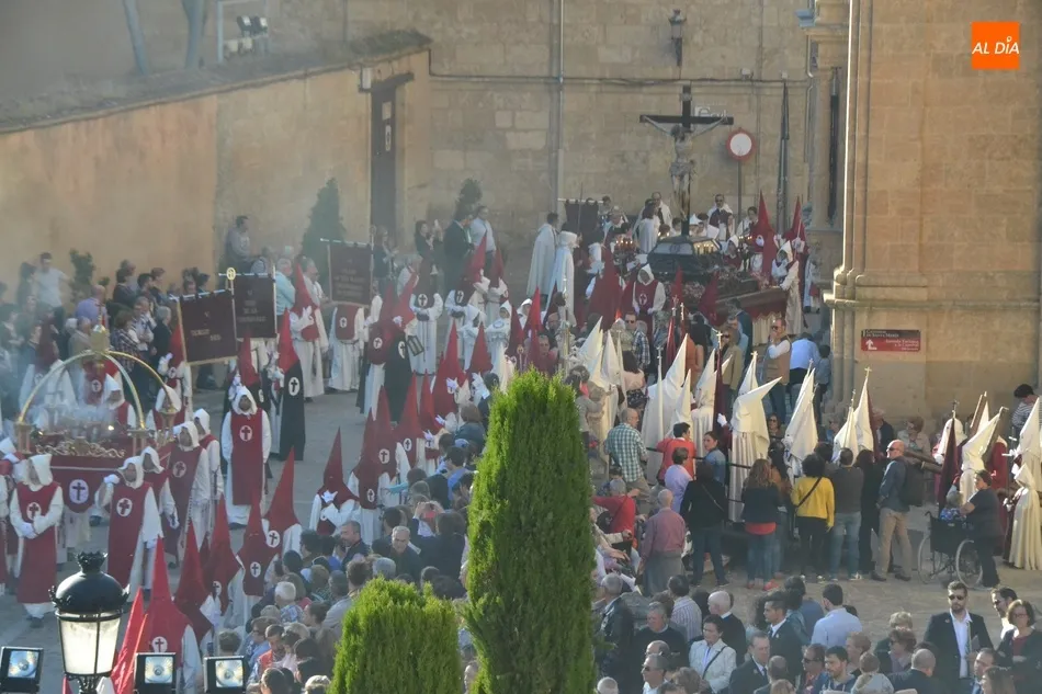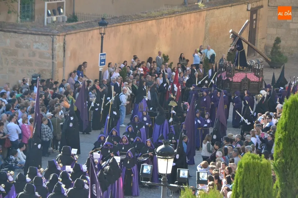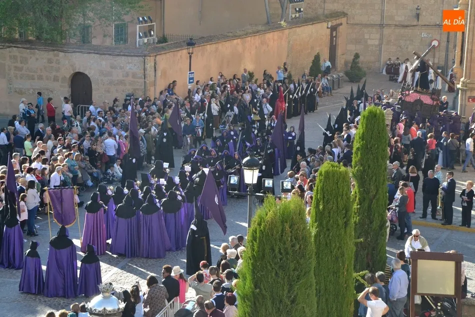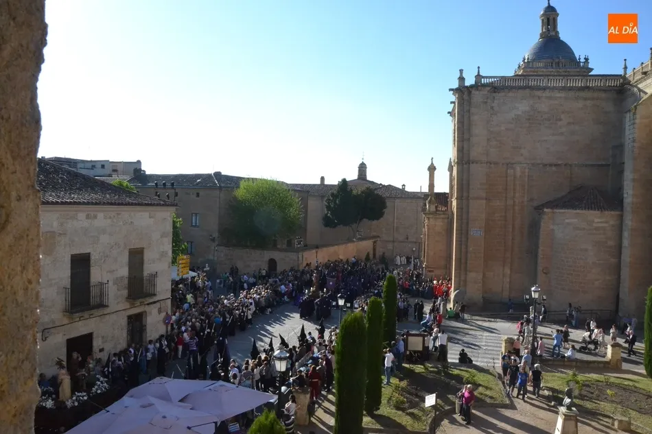 Allí se reunían con el Santo Sepulcro y la imagen de La Soledad (que salían por la Puerta de las Cadenas), para hacer un trayecto por las siguientes calles: Plaza de San Salvador, Campo del Gallo, calle de Pendabales (General Pando), calle del Príncipe, Campo del Carro, Plazuela del Lirio, calle de los Colegios, y Campo del Trigo (Plazuela Cristóbal de Castillejo), para entrar por la puerta principal de la Iglesia de San Pedro, atravesarla y salir a la calle de Gigantes, para continuar hacia la Plaza Mayor, calle de la Tabernilla (calle Madrid), Plaza del Conde, y calle Cadimus para entrar en la Catedral por la Puerta del Enlosado.