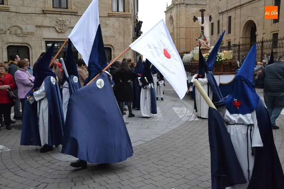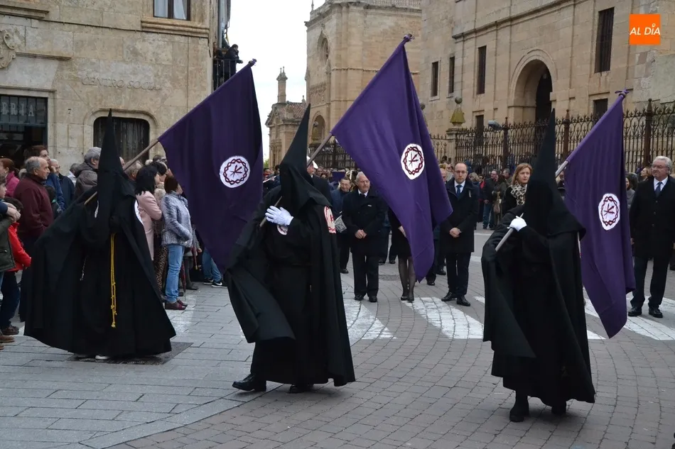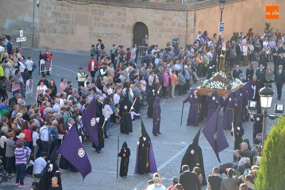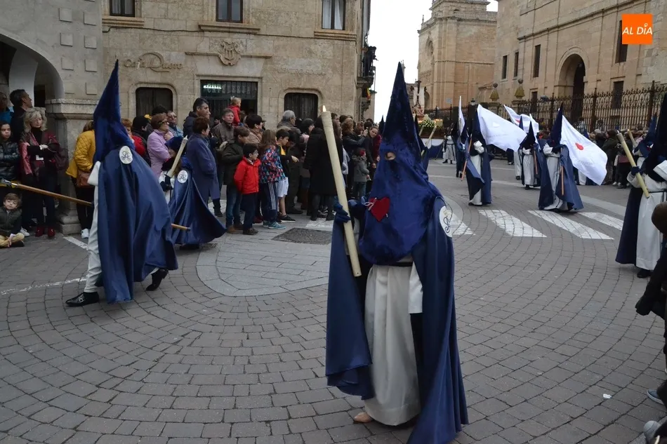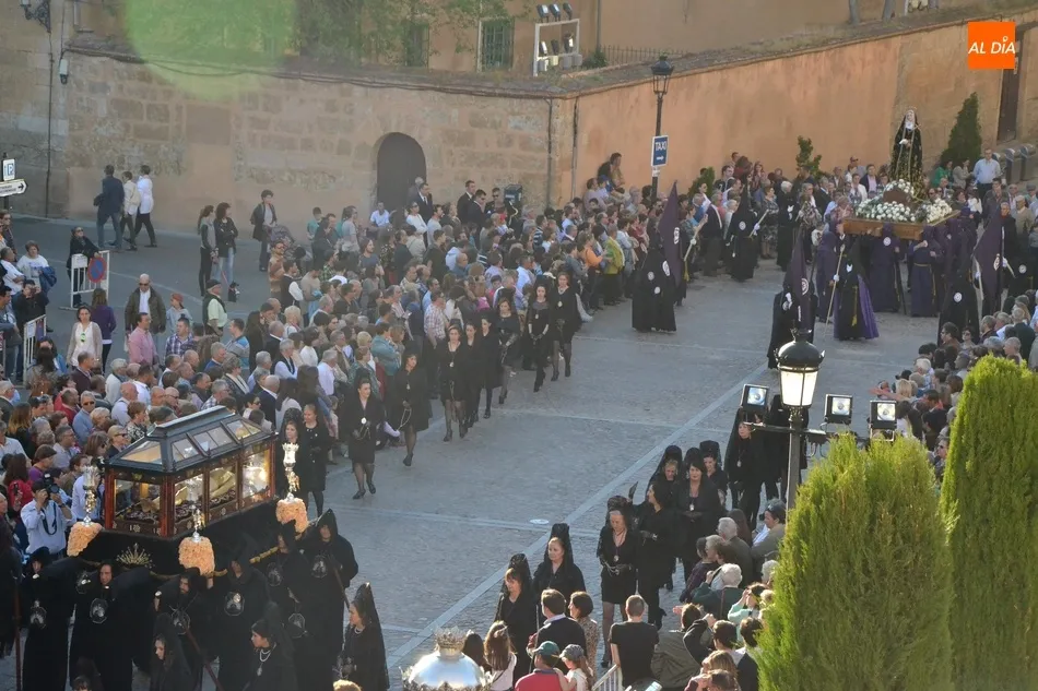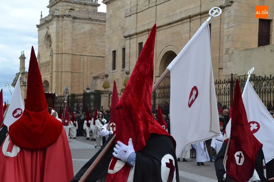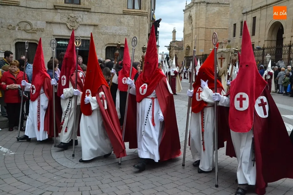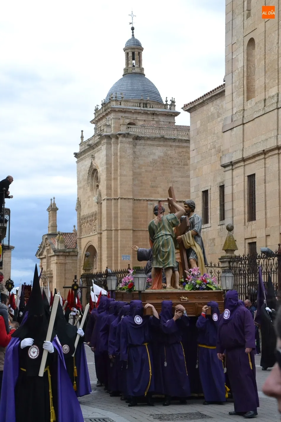 Allí se reunían con el Santo Sepulcro y la imagen de La Soledad (que salían por la Puerta de las Cadenas), para hacer un trayecto por las siguientes calles: Plaza de San Salvador, Campo del Gallo, calle de Pendabales (General Pando), calle del Príncipe, Campo del Carro, Plazuela del Lirio, calle de los Colegios, y Campo del Trigo (Plazuela Cristóbal de Castillejo), para entrar por la puerta principal de la Iglesia de San Pedro, atravesarla y salir a la calle de Gigantes, para continuar hacia la Plaza Mayor, calle de la Tabernilla (calle Madrid), Plaza del Conde, y calle Cadimus para entrar en la Catedral por la Puerta del Enlosado.