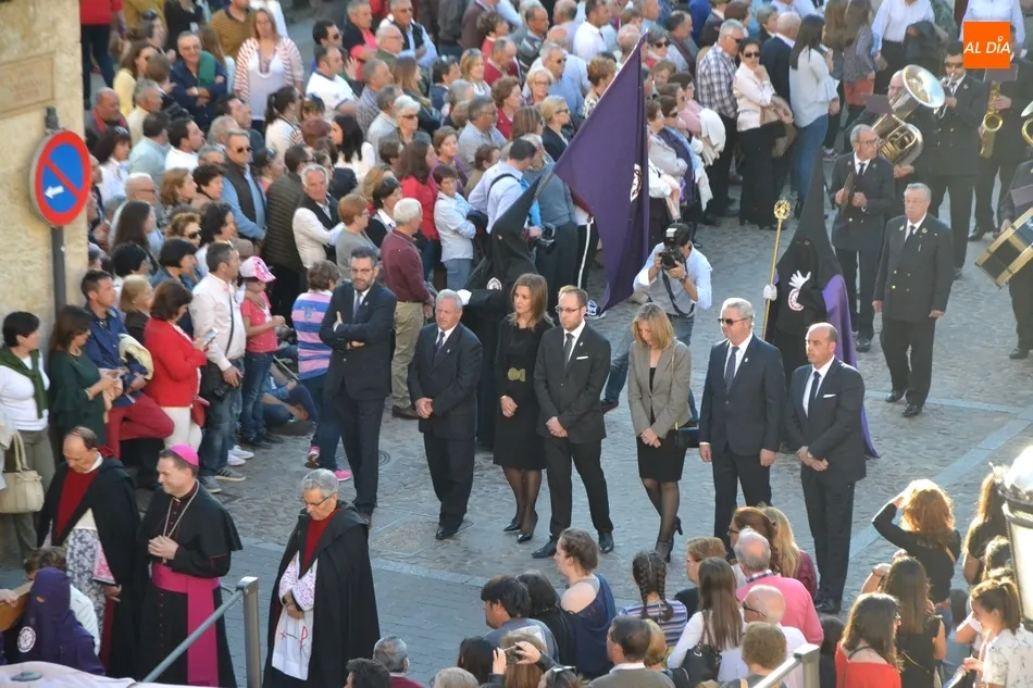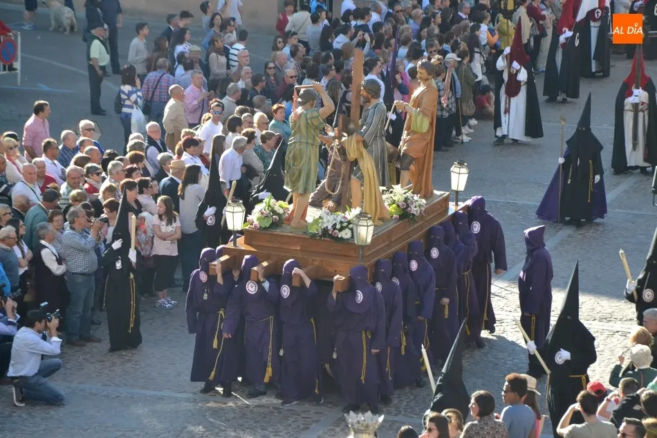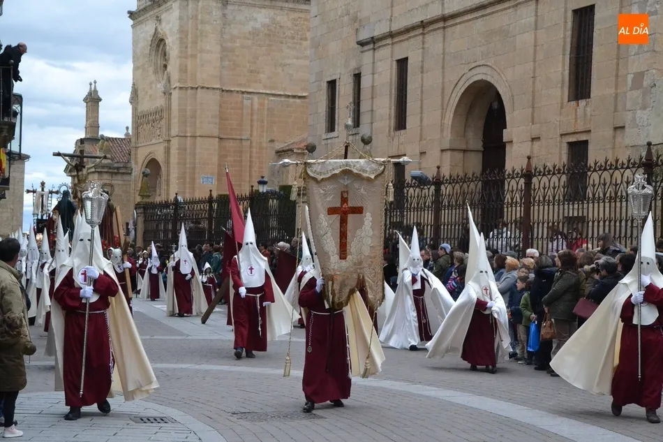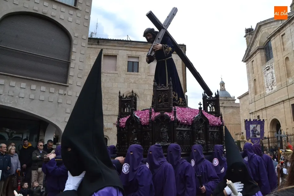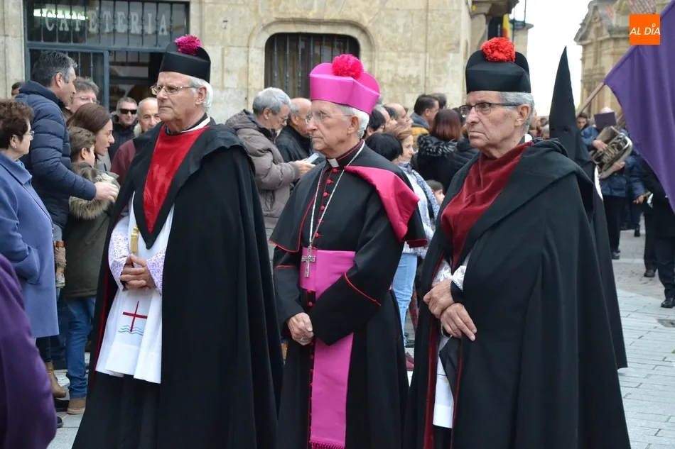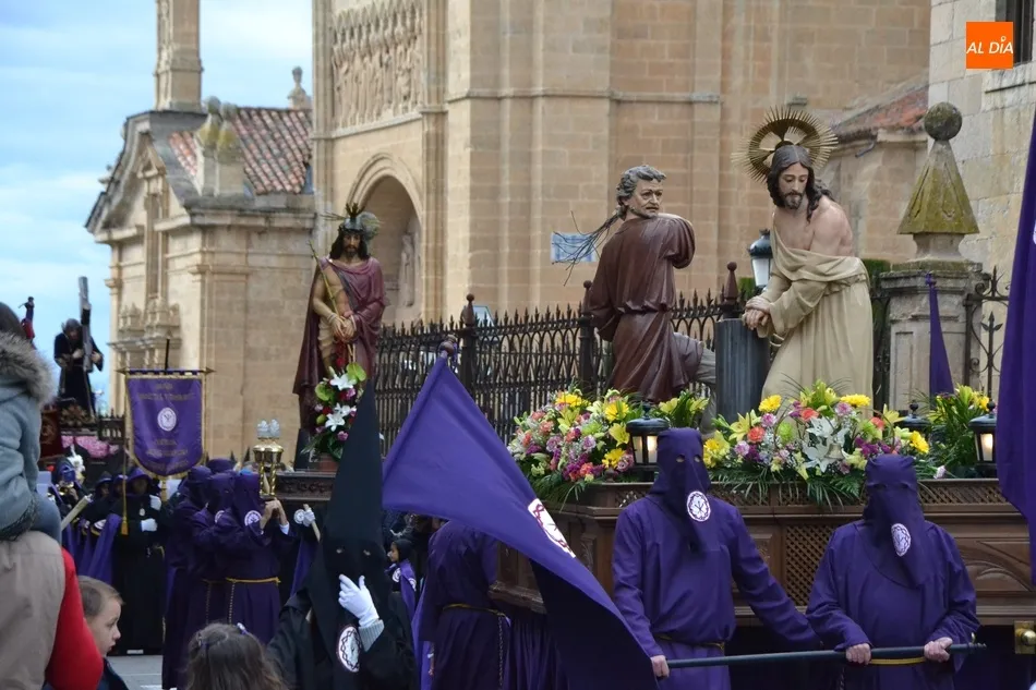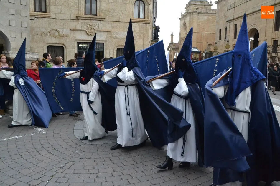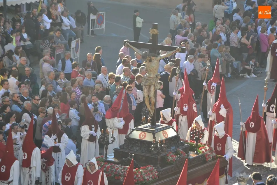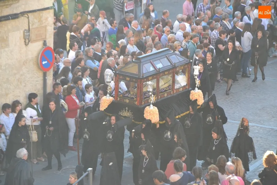 Allí se reunían con el Santo Sepulcro y la imagen de La Soledad (que salían por la Puerta de las Cadenas), para hacer un trayecto por las siguientes calles: Plaza de San Salvador, Campo del Gallo, calle de Pendabales (General Pando), calle del Príncipe, Campo del Carro, Plazuela del Lirio, calle de los Colegios, y Campo del Trigo (Plazuela Cristóbal de Castillejo), para entrar por la puerta principal de la Iglesia de San Pedro, atravesarla y salir a la calle de Gigantes, para continuar hacia la Plaza Mayor, calle de la Tabernilla (calle Madrid), Plaza del Conde, y calle Cadimus para entrar en la Catedral por la Puerta del Enlosado.