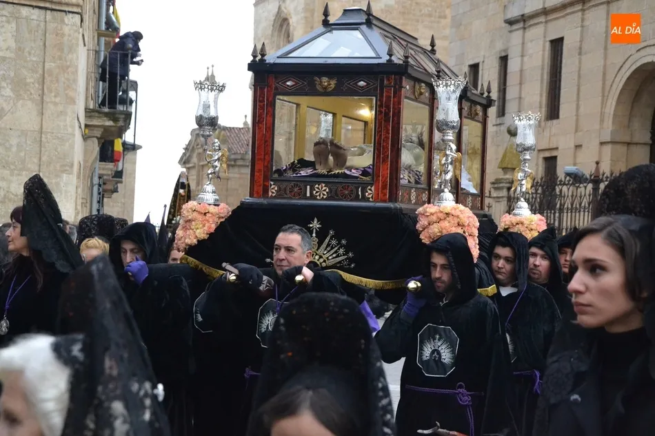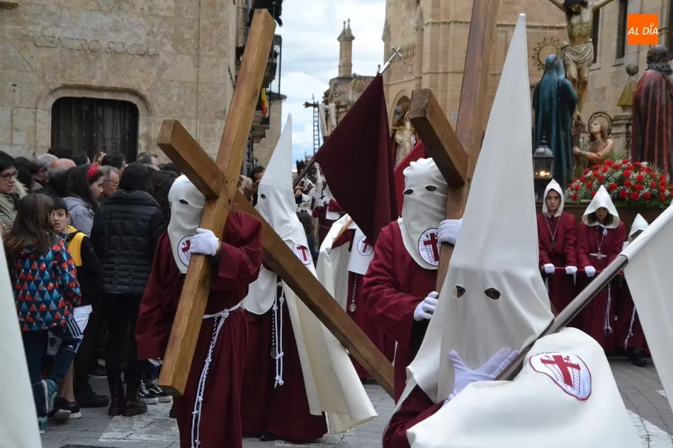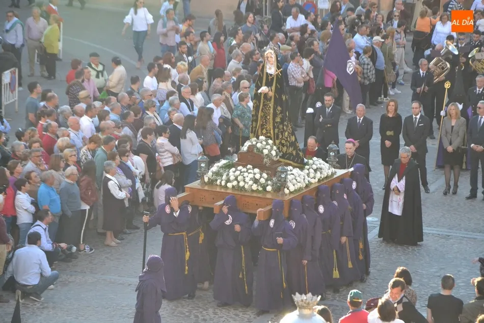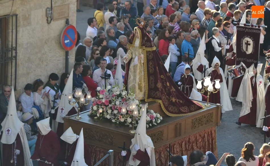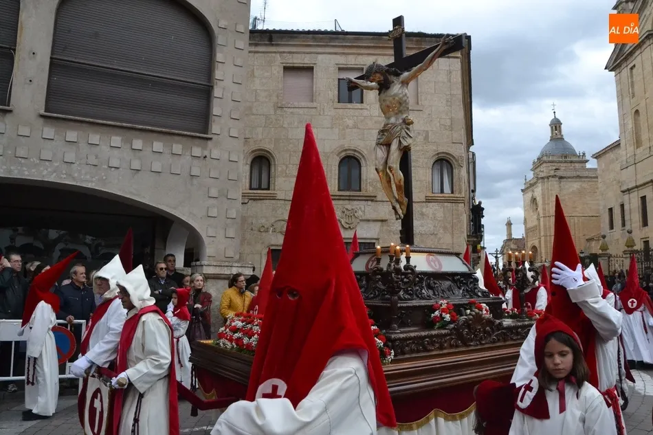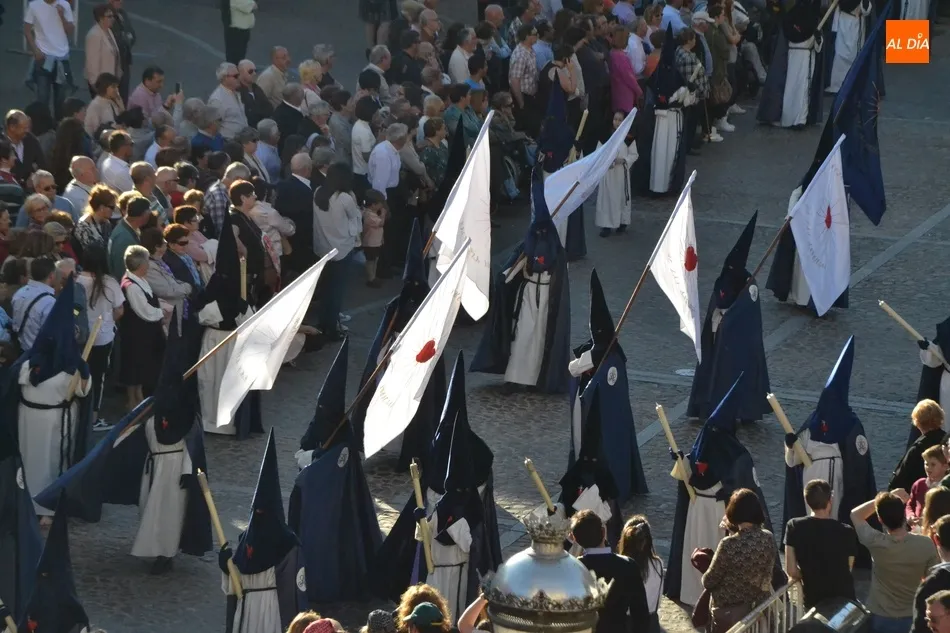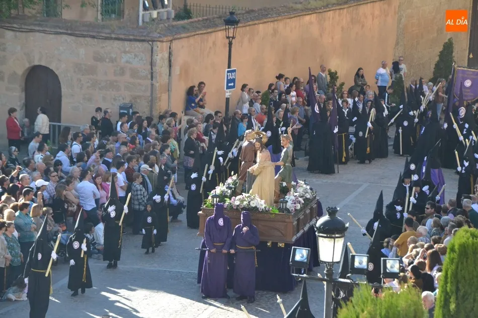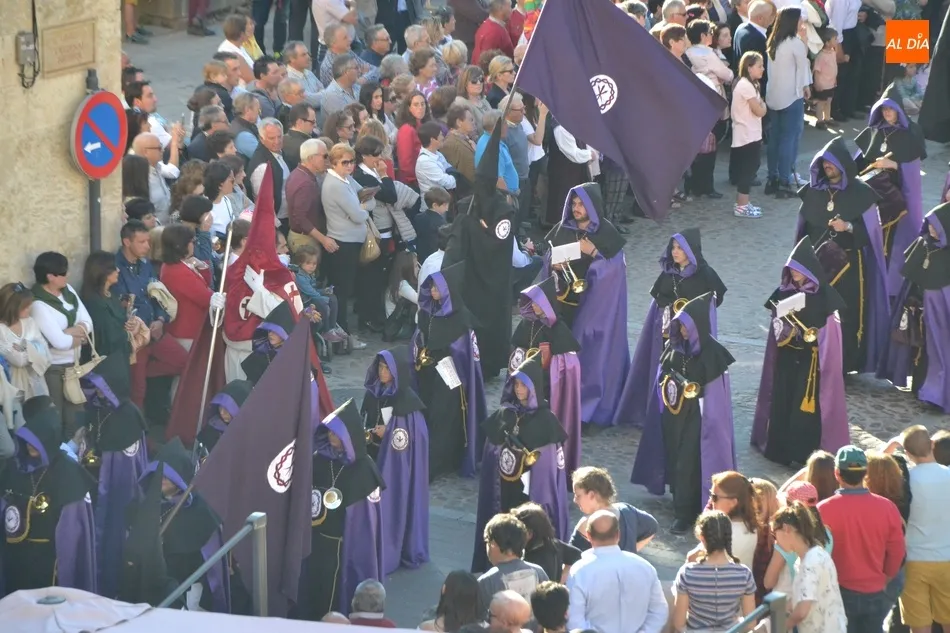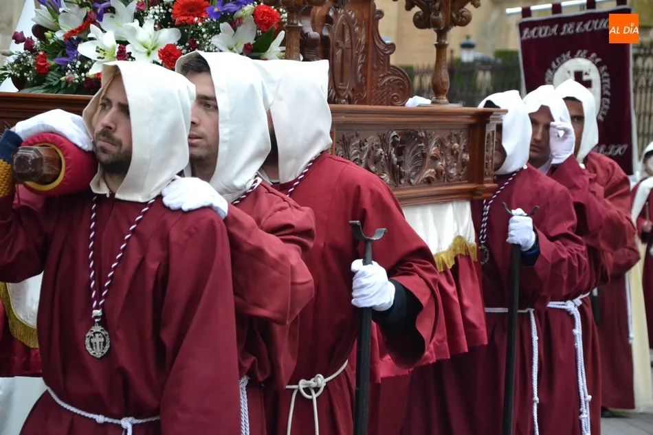 Allí se reunían con el Santo Sepulcro y la imagen de La Soledad (que salían por la Puerta de las Cadenas), para hacer un trayecto por las siguientes calles: Plaza de San Salvador, Campo del Gallo, calle de Pendabales (General Pando), calle del Príncipe, Campo del Carro, Plazuela del Lirio, calle de los Colegios, y Campo del Trigo (Plazuela Cristóbal de Castillejo), para entrar por la puerta principal de la Iglesia de San Pedro, atravesarla y salir a la calle de Gigantes, para continuar hacia la Plaza Mayor, calle de la Tabernilla (calle Madrid), Plaza del Conde, y calle Cadimus para entrar en la Catedral por la Puerta del Enlosado.