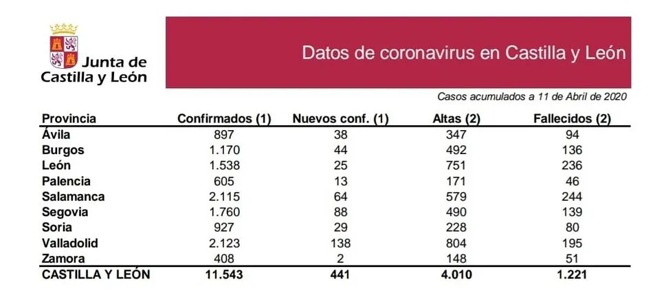 Castilla y León ha sumado 441 nuevos casos confirmados de personas infectadas por coronavirus por lo que la cifra total asciende a 11.543, un 3,4 por ciento más pero inferior al 5,5 de incremento respecto de la jornada del viernes, en la que se contabilizaron 584 nuevos, según los datos aportados por la consejera de Sanidad, Verónica Casado.