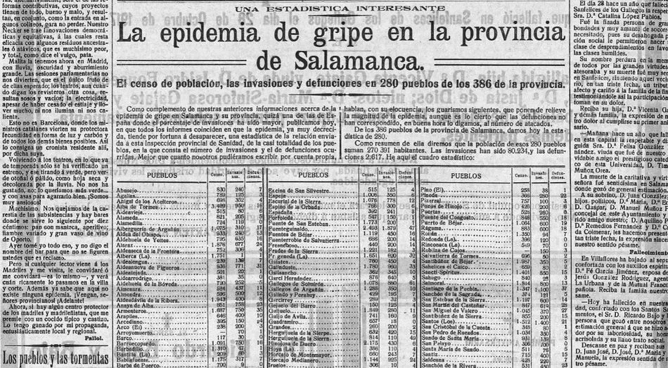 La epidemia vivida hace 102 años tuvo consecuencias mucho más graves que las que estamos viviendo actualmente. La ausencia de un sistema de salud y la falta de apropiados medicamentos y materiales provocó que en Salamanca fallecieran en torno a 6.000 personas. De ellas, unas 4.000 perecieron en la capital charra, por su parte, en el total de pueblos de la provincia de Salamanca las cifras fueron especialmente altas, un total de 80.234 personas infectadas de un censo de 270.391 habitantes. El número de fallecidos ascendió a 2.617.
