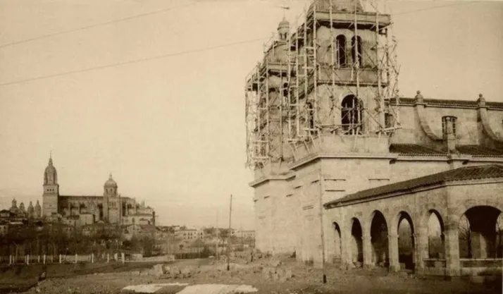 Antonio Blazquez?, moderador del grupo FOTOS ANTIGUAS DE SALAMANCA, publica esta foto, de autor desconocido sobre la última etapa de la construcción de la Iglesia Nueva del Arrabal.