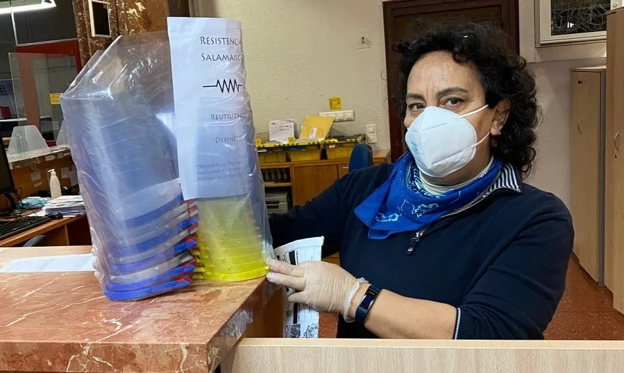 ?Resistencia Salamanca? sigue su labor solidaria de frabricación y distribución gratuita de pantallas protectoras. Una red solidaria que en las últimas horas llegaba a las oficinas de Correos de la Gran Vía, la avenida de Agustinos Recoletos, el polígono de Villares de la Reina, Villamayor y de Peñaranda de Bracamonte.