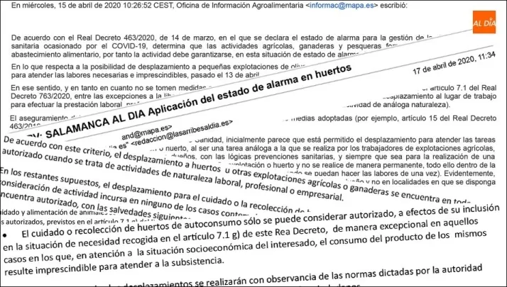 Como ya ha publicado este diario, en nuestro poder reza un documento, una copia de un correo electrónico, en el que Agricultura responde a una subdelegación del Gobierno la pregunta sobre si los vecinos pueden desplazarse hasta el huerto para realizar las labores necesarias, cuestión que a su vez había sido planteada por un ayuntamiento a la subdelegación. Como ya informamos, este periódico no ha podido hacer público este documento para no comprometer a nuestra fuente. En ese documento, Agricultura señala que ?se trata de una actividad que no está limitada por el RD 463/2020, de 14 de marzo, de declaración de estado de alarma, y que por tanto puede desarrollarse, aunque con sujeción a las medidas generales de prevención sanitaria y sin que pueda constituir subterfugio para la elusión del régimen de restricción a la movilidad ciudadana?, respuesta casi idéntica a la que realiza a uno de nuestros lectores el pasado 15 de abril y cuyo correo electrónico nos ha sido reenviado.